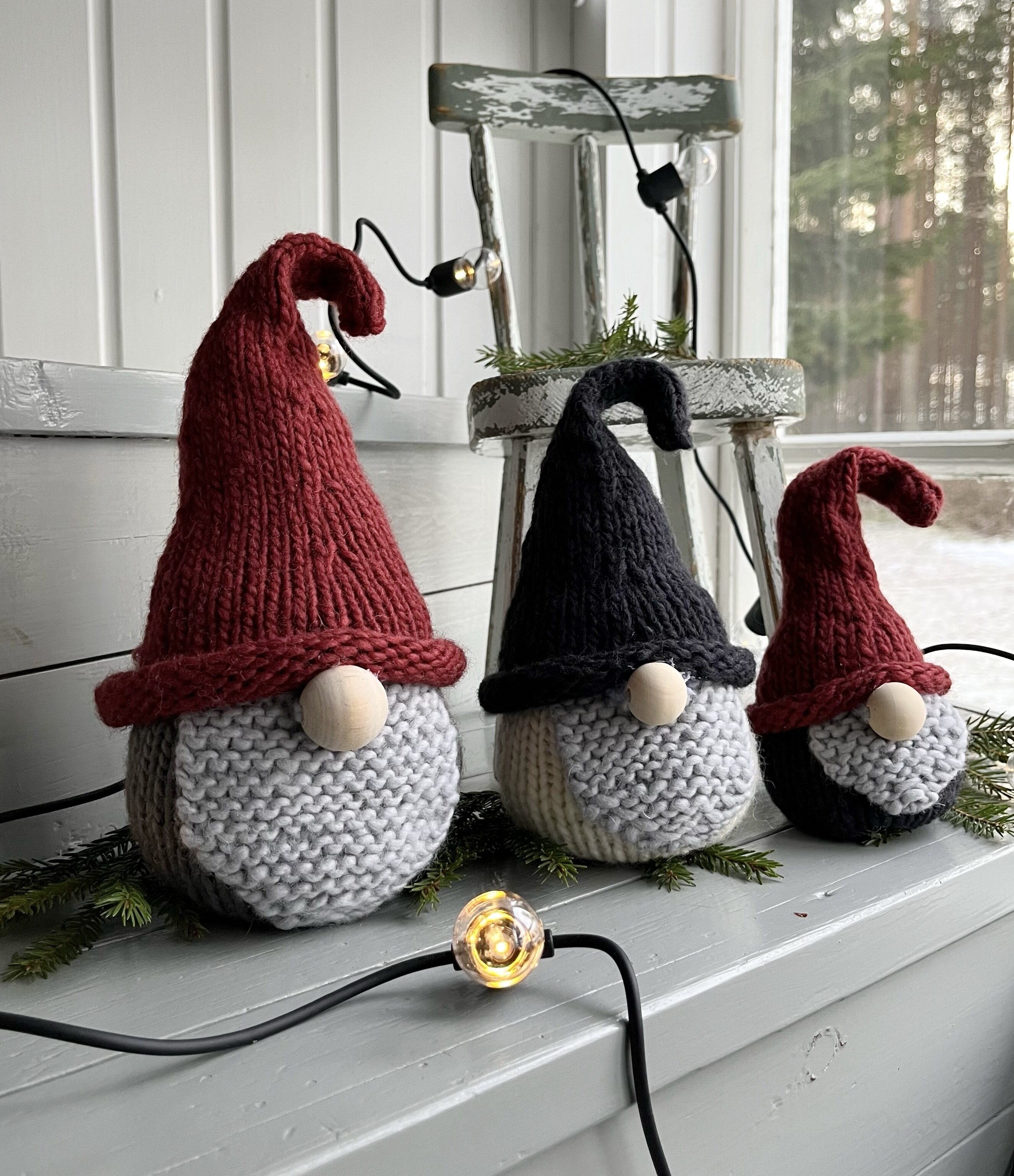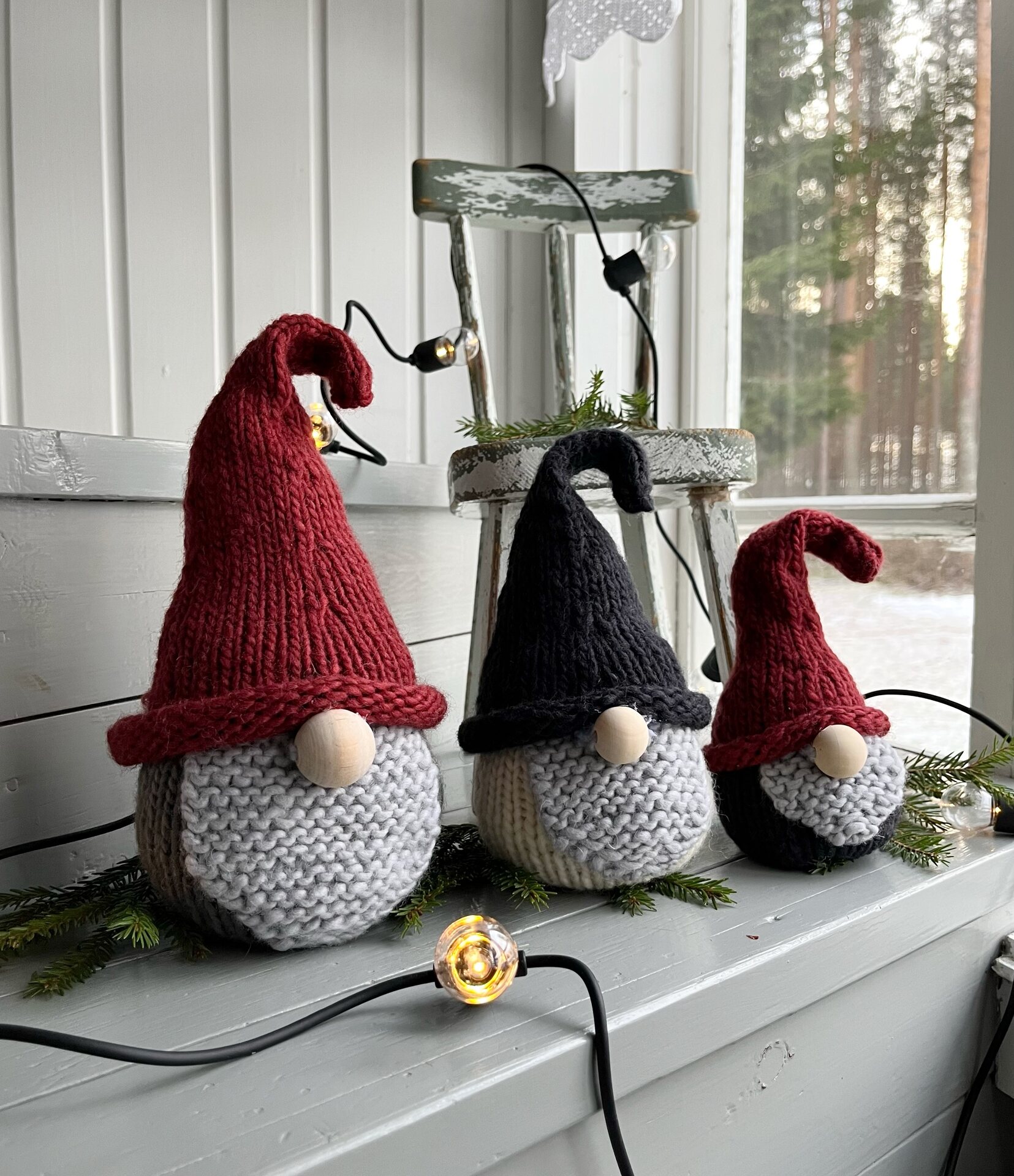 Iso tonttu: 3 kerää Satama-lankaa (yksi kerä per väri: vartalo, lakki ja parta. Yhdestä partakerästä riittää kaikkiin kolmeen tonttuun).