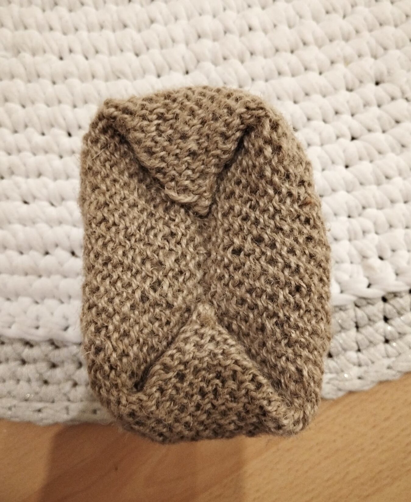 Luo pyöröpuikoille 60 silmukkaa ja neulo sileää neuletta, kunnes työn korkeus on 23 cm. Päätä silmukat. Käännä pussi nurin päin ja ompele pohja kiinni. Taita pohjan kulmissa kuvan mukaiset kolmiot ja harsi ne varovasti kiinni pussin pohjaan.