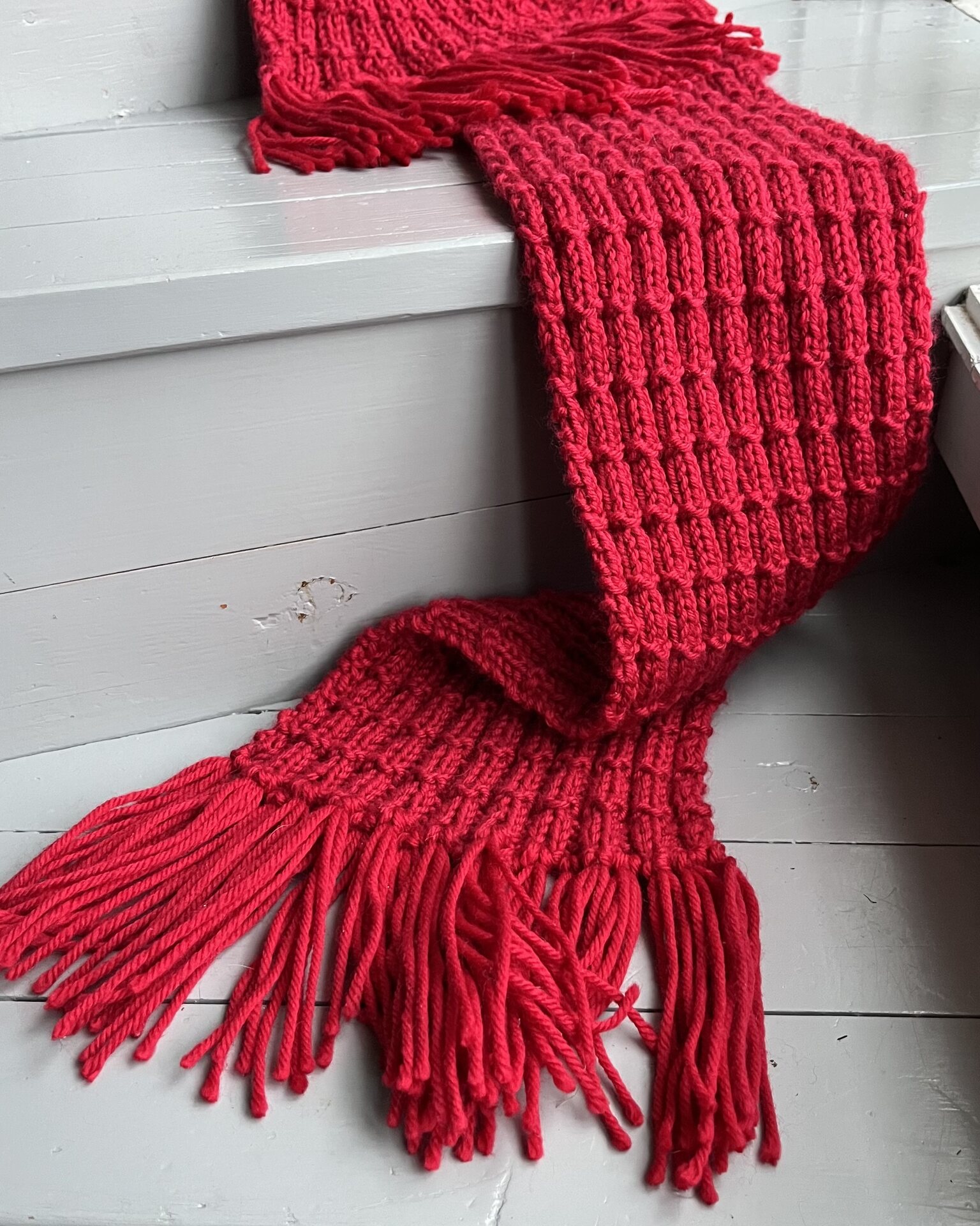 Huom: Päätä työ neulomalla lopuksi sama neljän kerroksen 2 o, 2 n joustin kuin alussa, jotta huivin päät ovat samanlaiset.