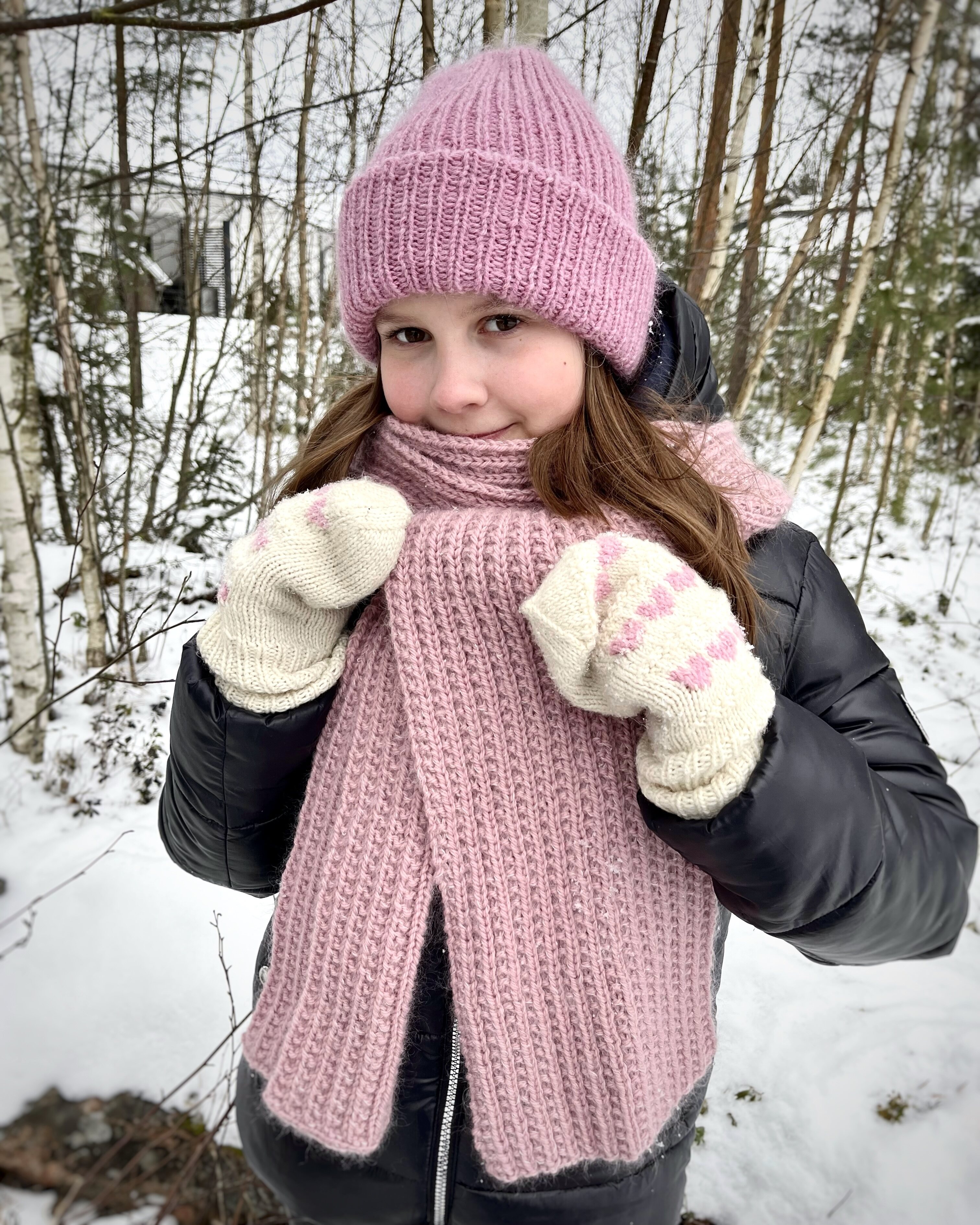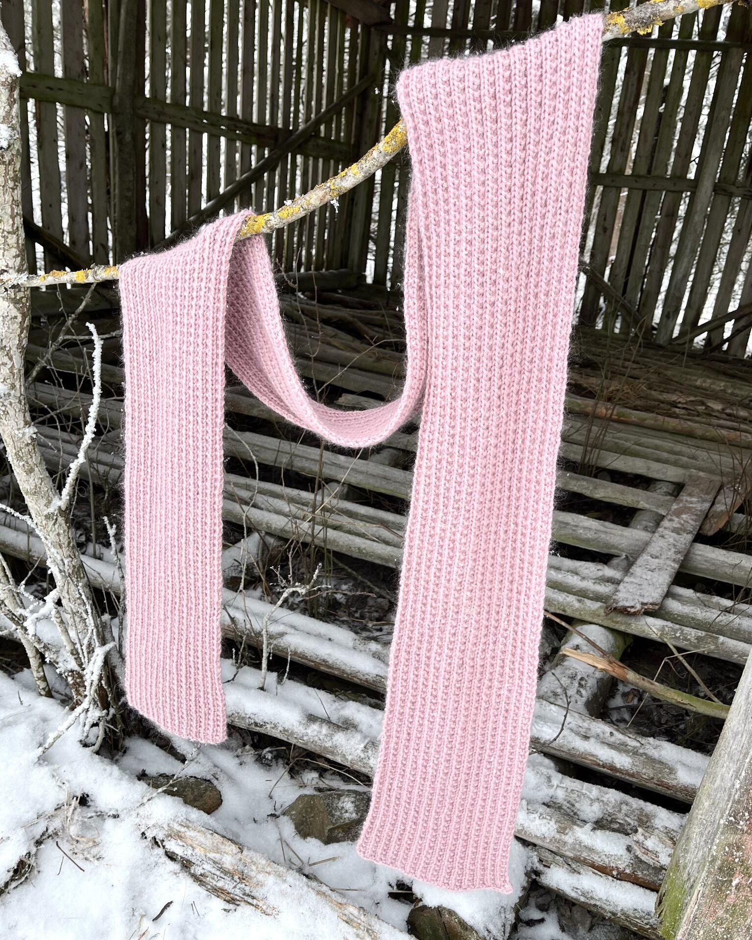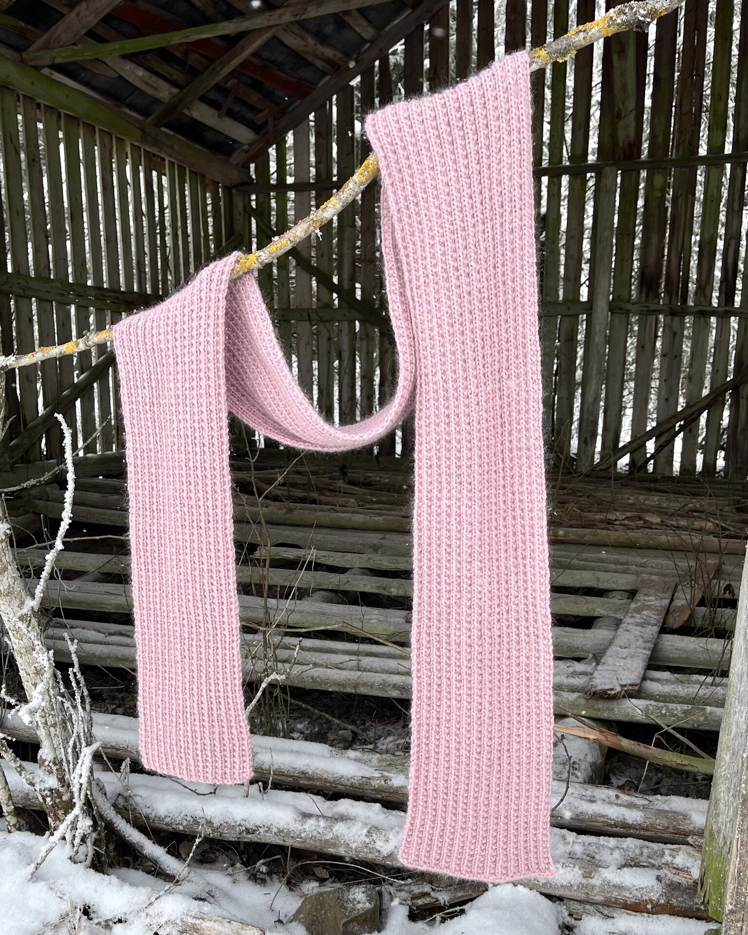 Jatka näin koko työ, kunnes jäljellä on päättelyyn riittävä lankamäärä. Päättele silmukat löyhästi. Päättele langanpäät huolellisesti, ja nyt kaunis kaulahuivi on valmis käyttöön.