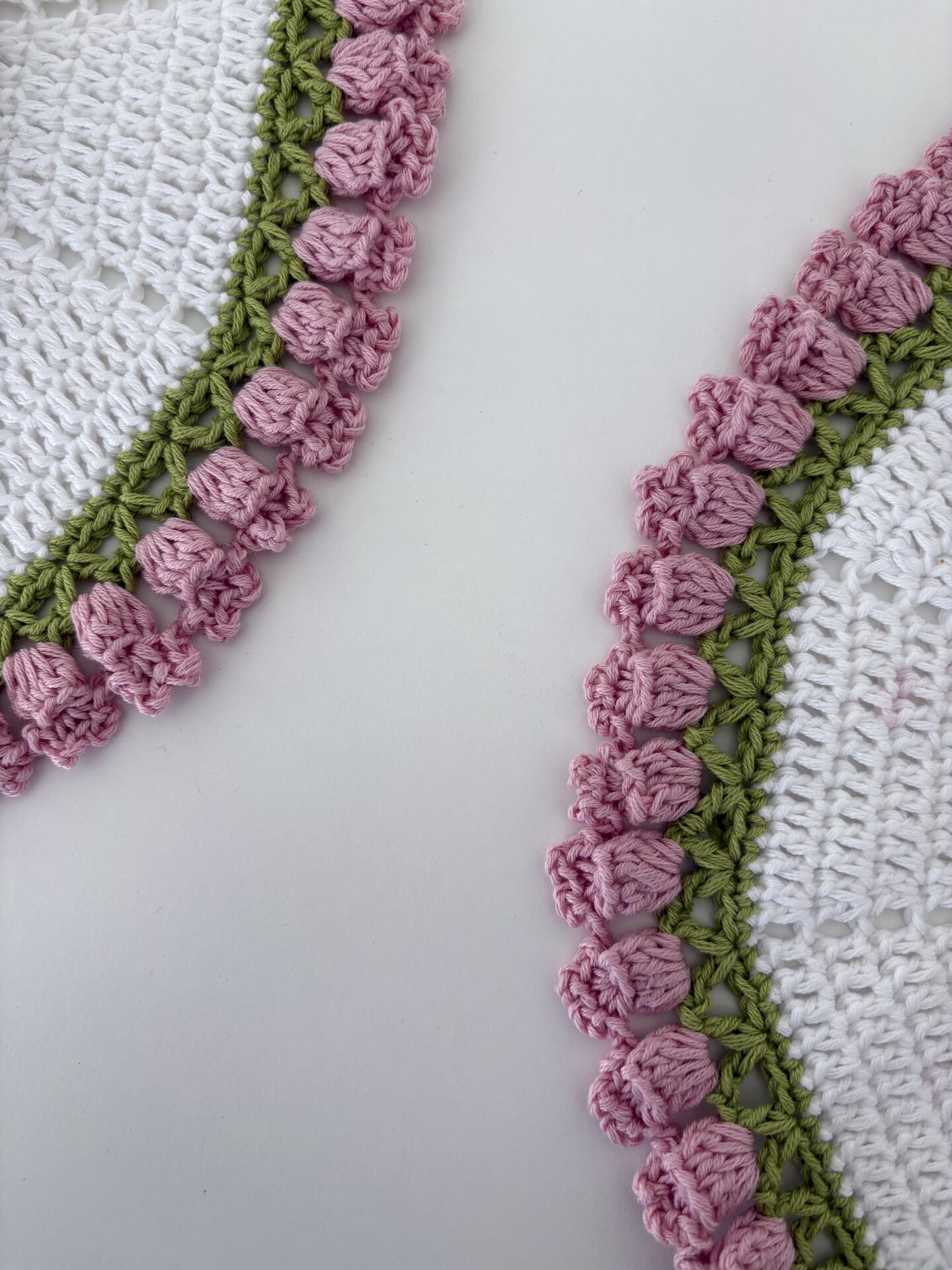 8. Krs: virkkaa 3 kjs, 5 p, 2 p samaan s, 1 kjs.