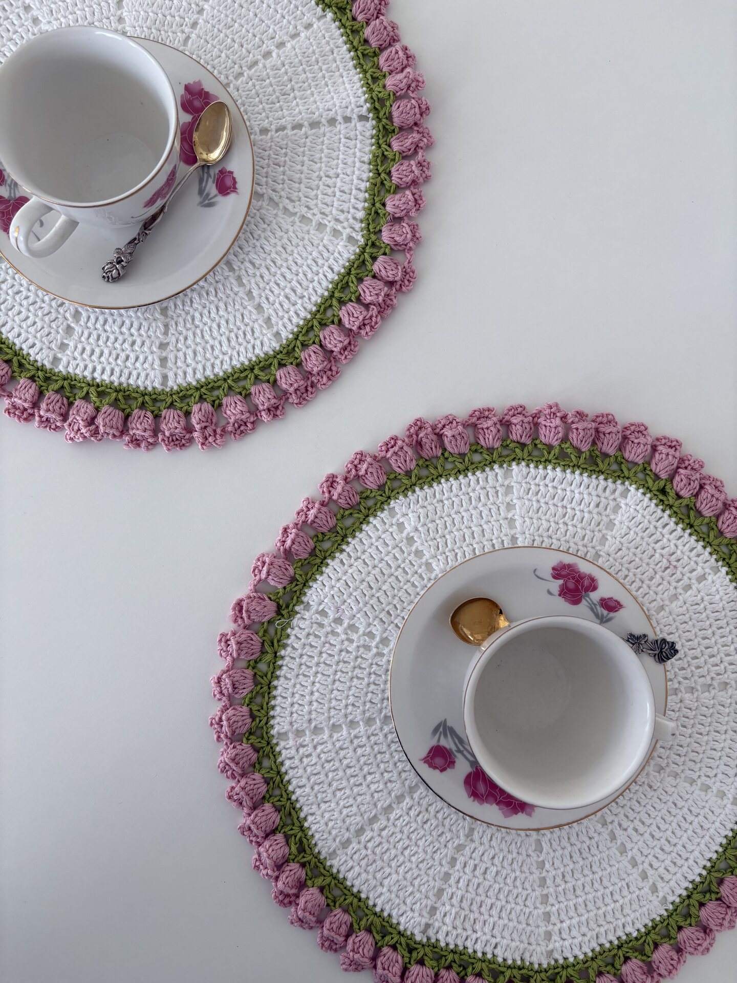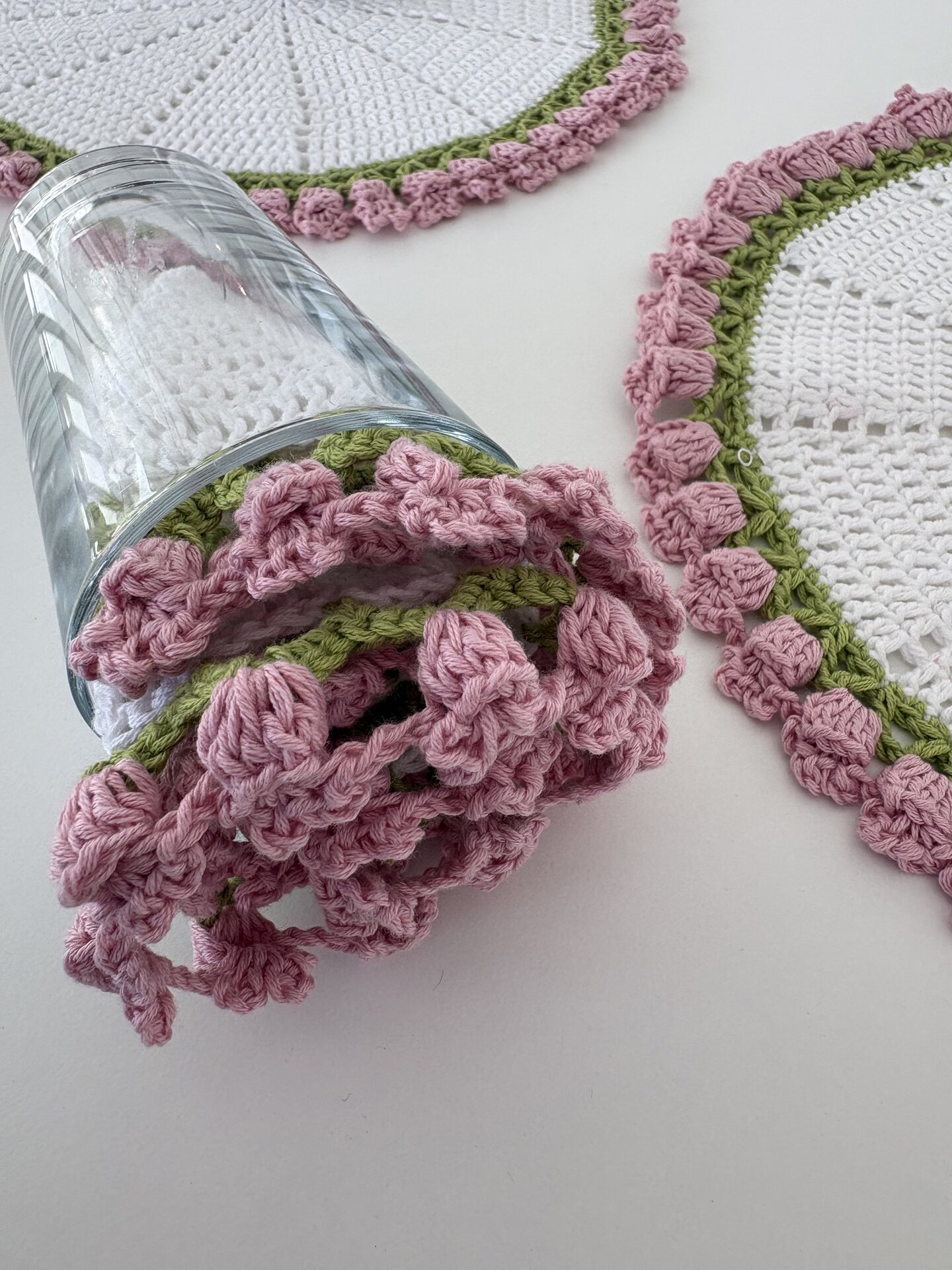 16. Krs: vaihda lanka vaaleanpunaiseen. Ensimmäinen kukka: Virkkaa 3 kjs(=pylväs),
