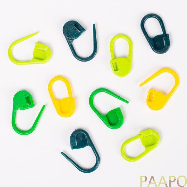 Kiinnitettävät silmukkamerkit (30 kappaleen pakkaus), värit vihreä ja keltainen.