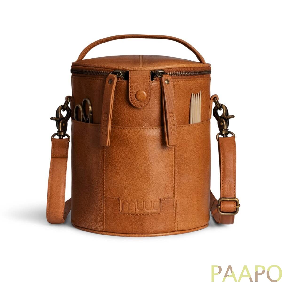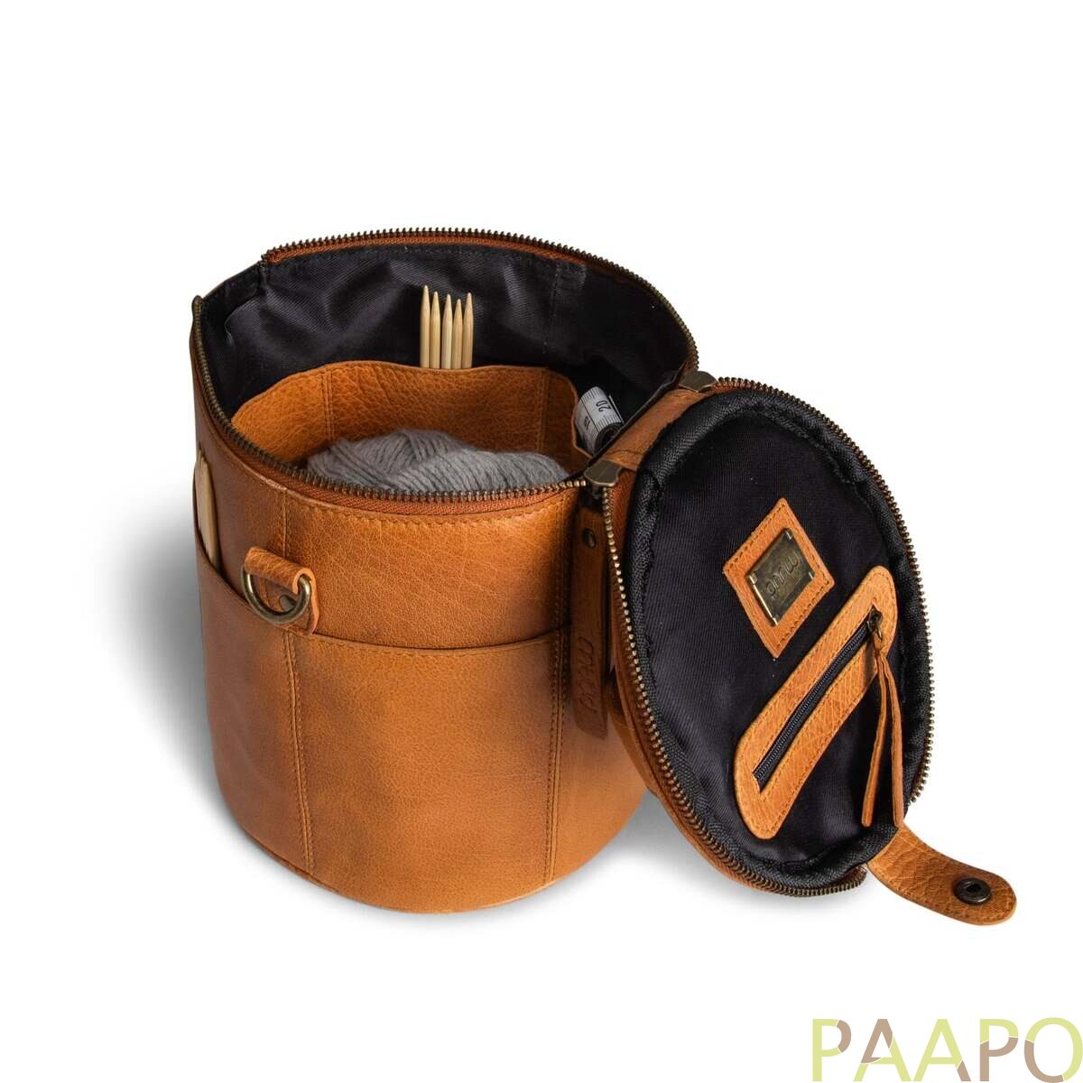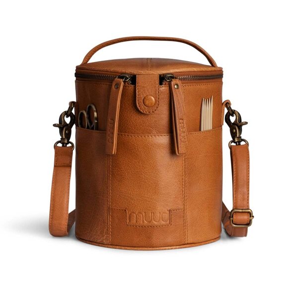 Saturn is a stylish, handcrafted leather bag for storing and transporting knitting and crochet projects.