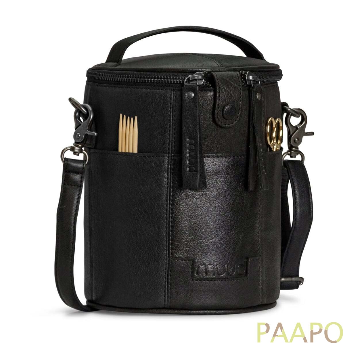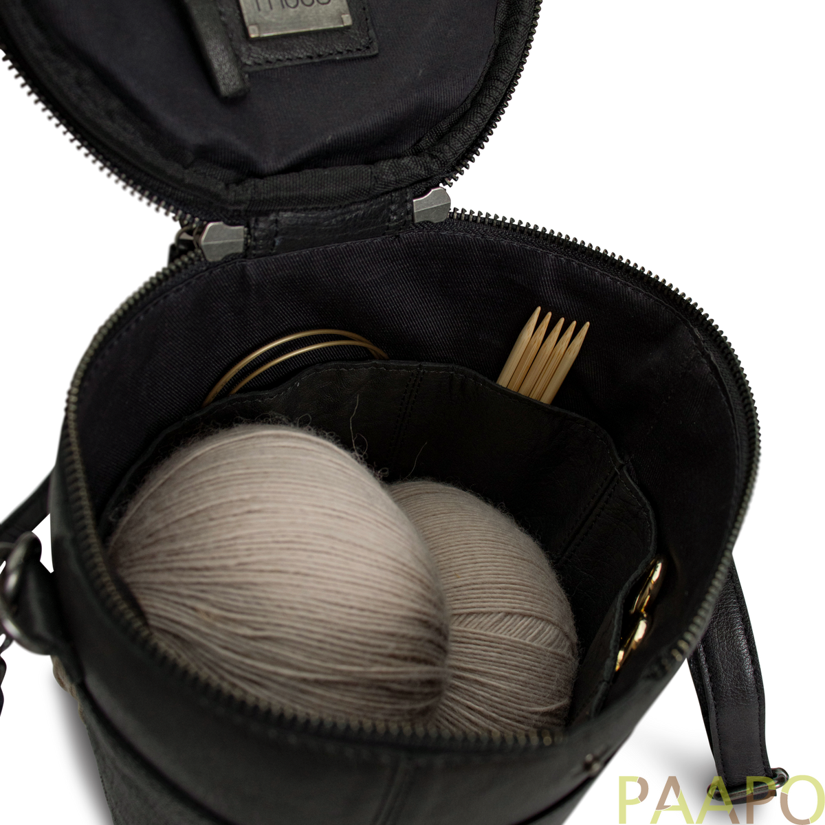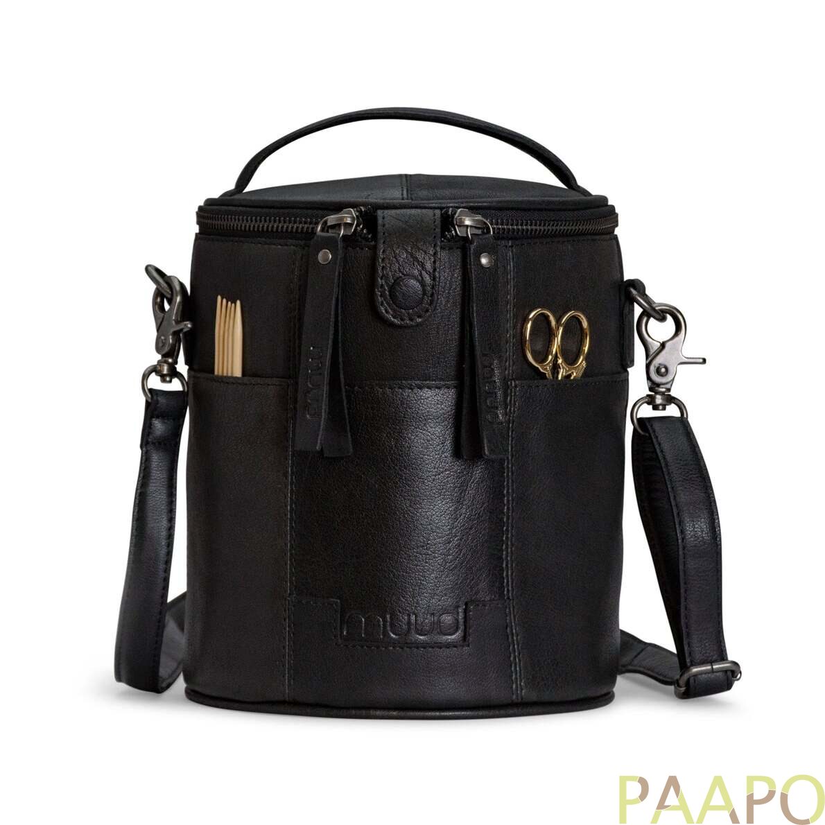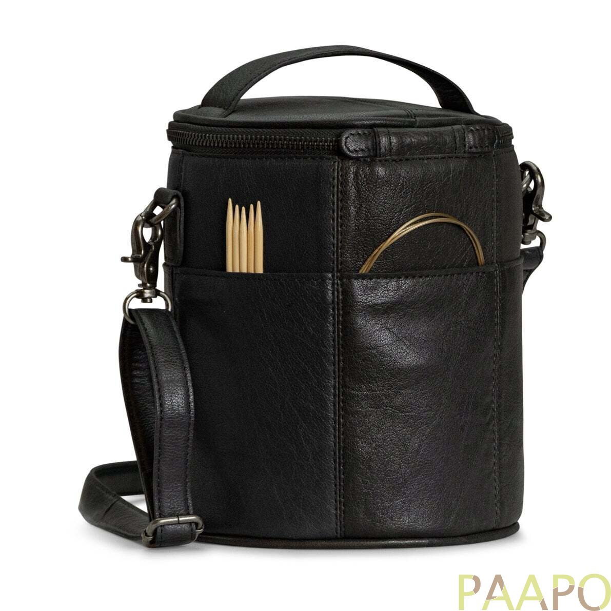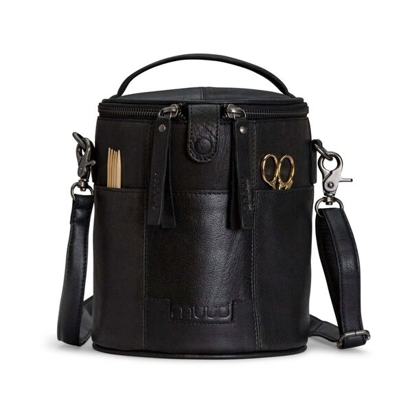Saturn is a stylish, handcrafted leather bag for storing and transporting knitting and crochet projects.