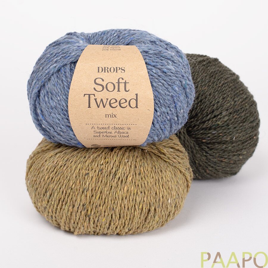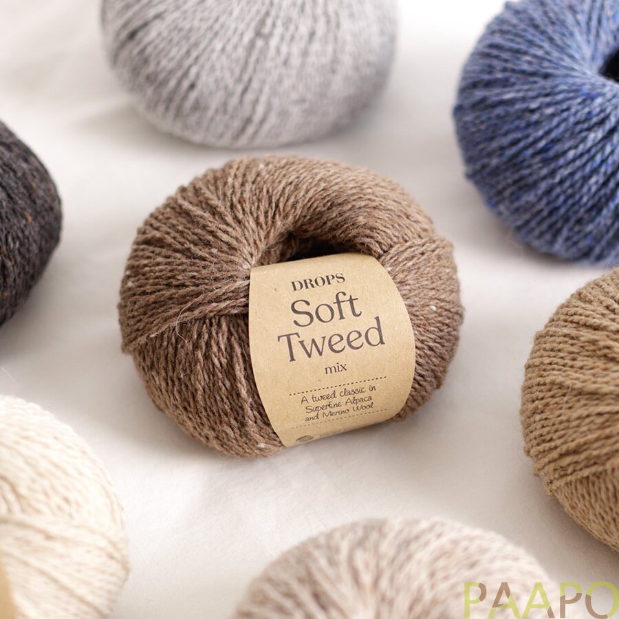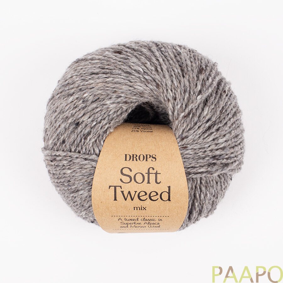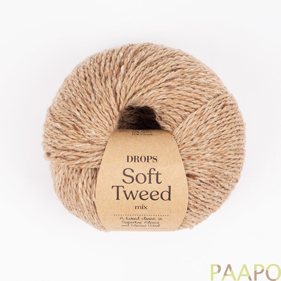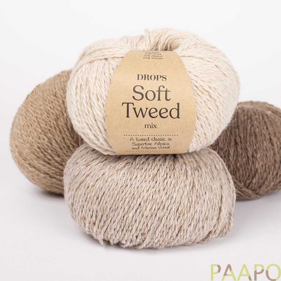 DROPS Soft Tweed is, as the name suggests, a soft tweed yarn. The yarn is made from merino wool, superfine alpaca and viscose. The yarn is created by carding these fibres together with small felted “tweed buttons”, which give the yarn small specks of colour. DROPS Soft Tweed is a carded yarn, which means it is lighter and more breathable than similar worsted yarns - this yarn is a great choice when knitting by hand.