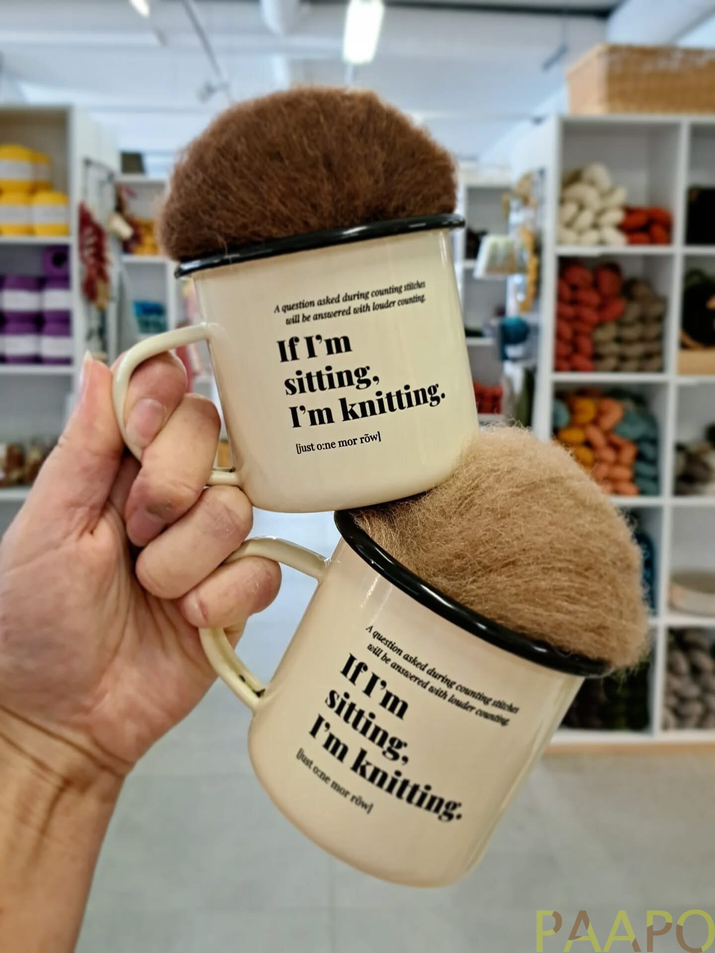 Under the mug you can find the text "Second series of mugs printed in 2022." & "Enjoy a hot drink for the best knitting experience."