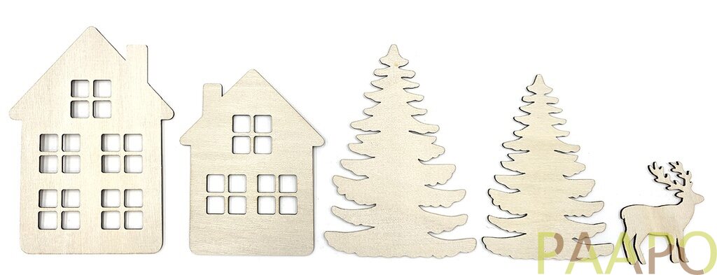 Wooden houses, fir trees, reindeer for crafts and decoration.