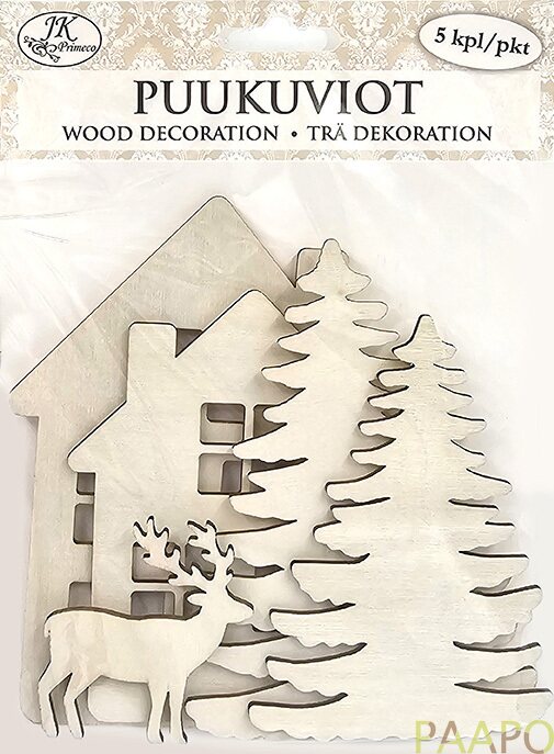 The package includes two wooden houses in two different sizes, two fir trees and a deer.