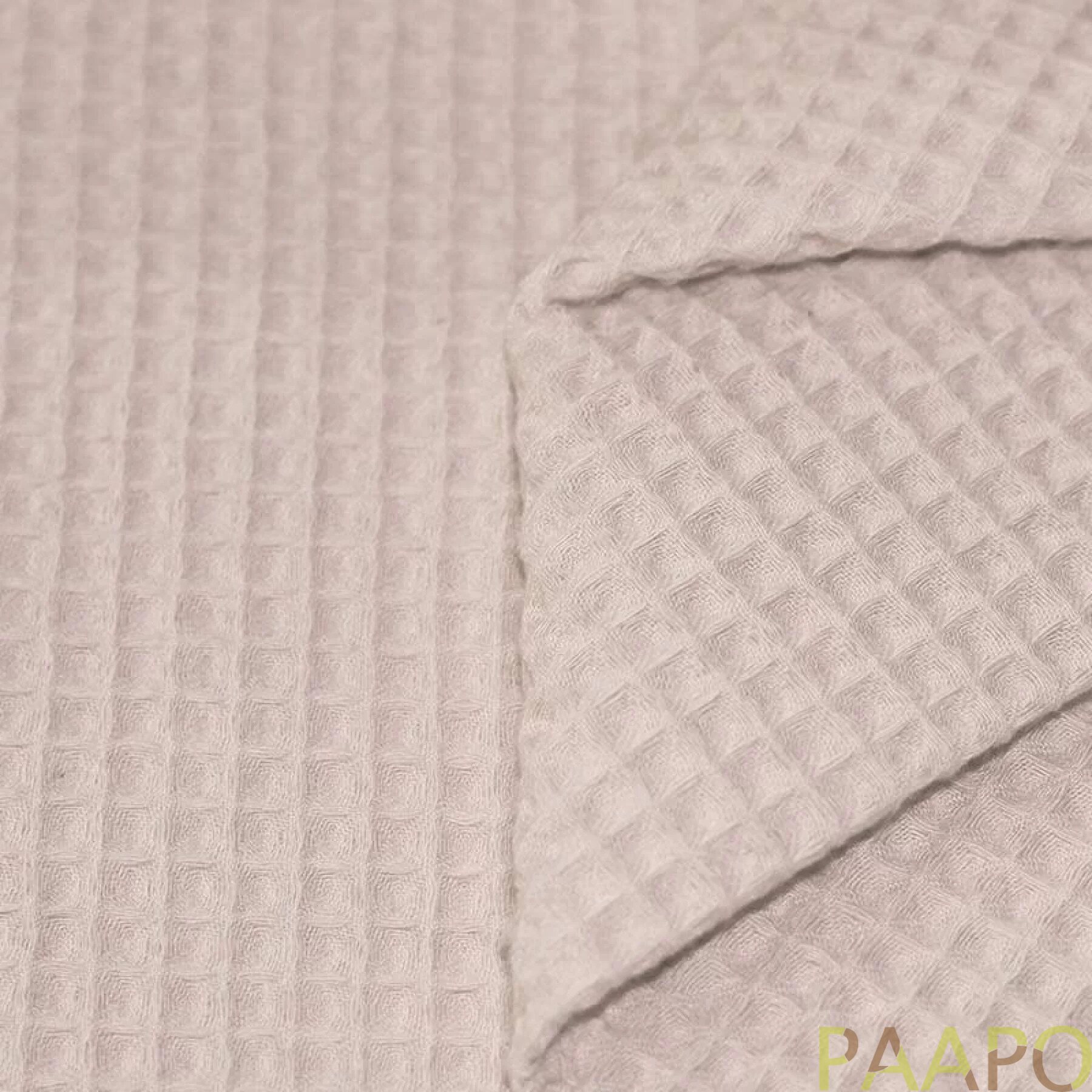 Waffle fabric is a woven fabric known for its comfortable and thick quality. The fabric feels even fuller after washing, so we recommend washing it before use due to shrinkage. Waffle fabric is made from 100% cotton. This fabric gets its name from the waffle structure of the weave, which forms small squares or cubes on the surface of the fabric.