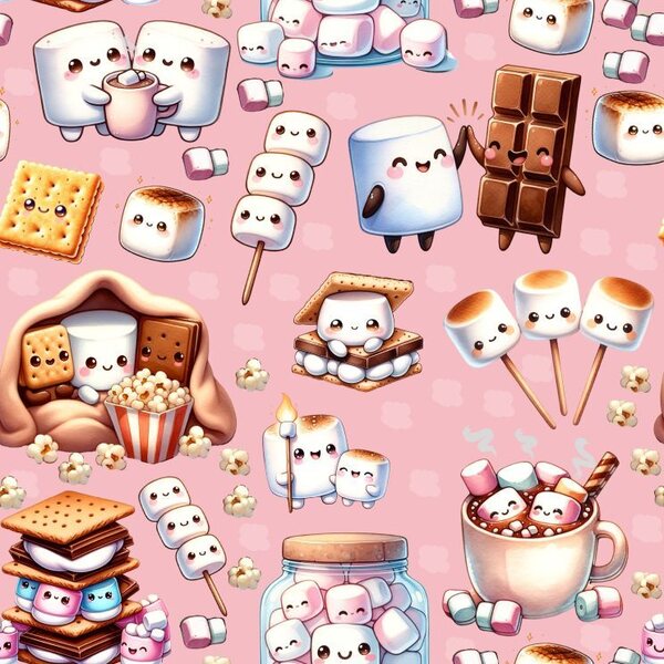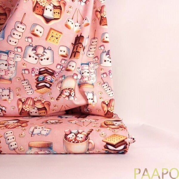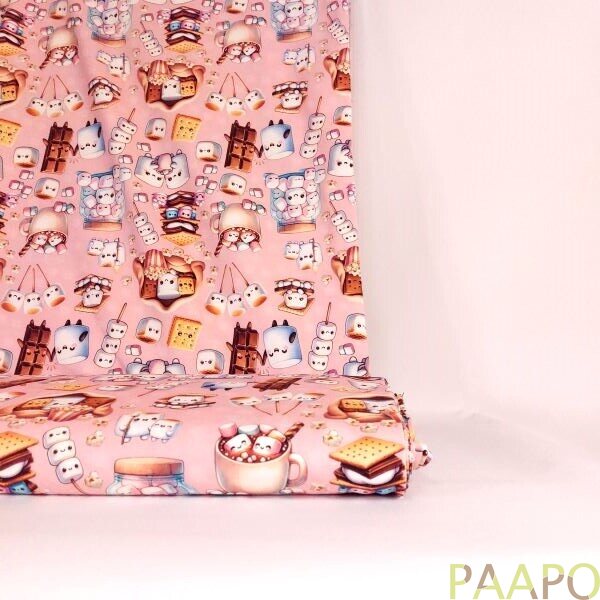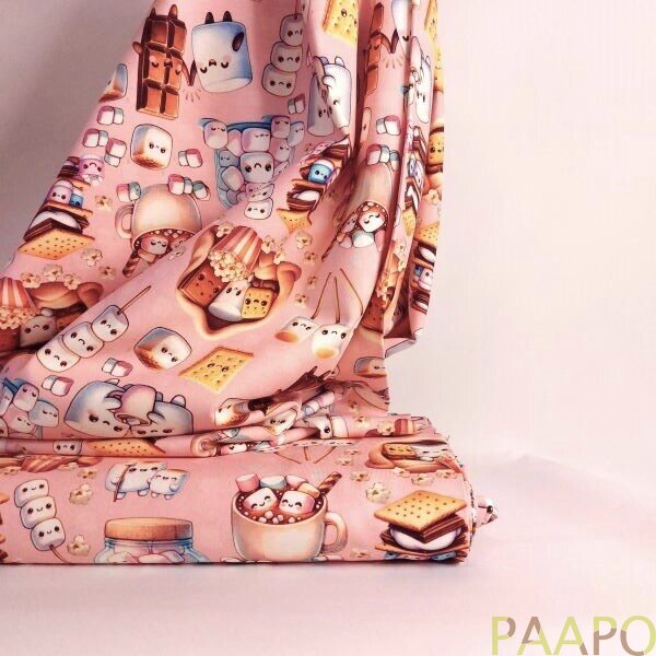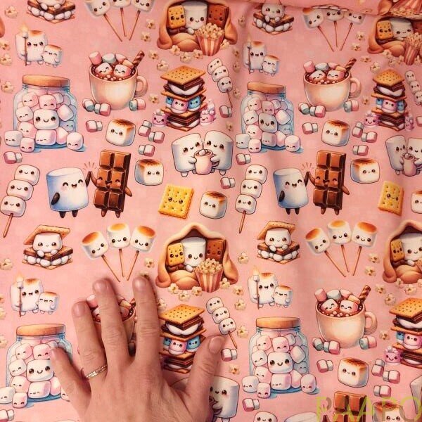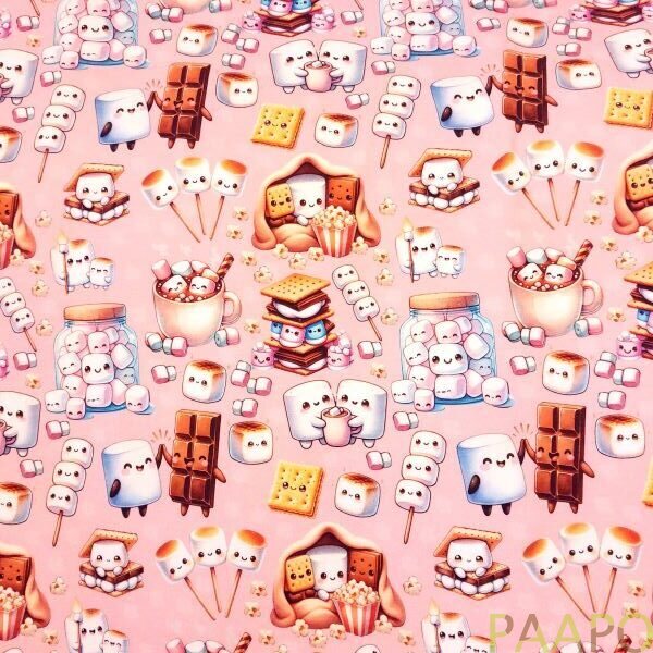 A marshmallow here and a marshmallow there. Cute treat characters on high-quality printed jersey fabric.