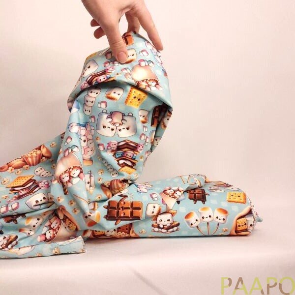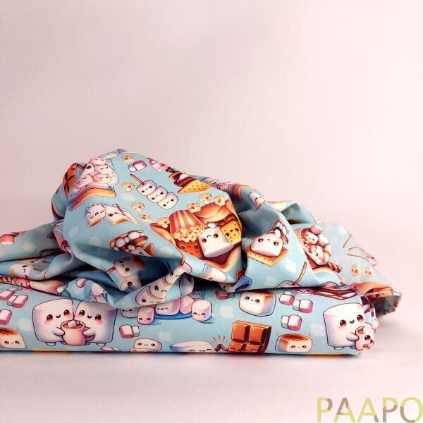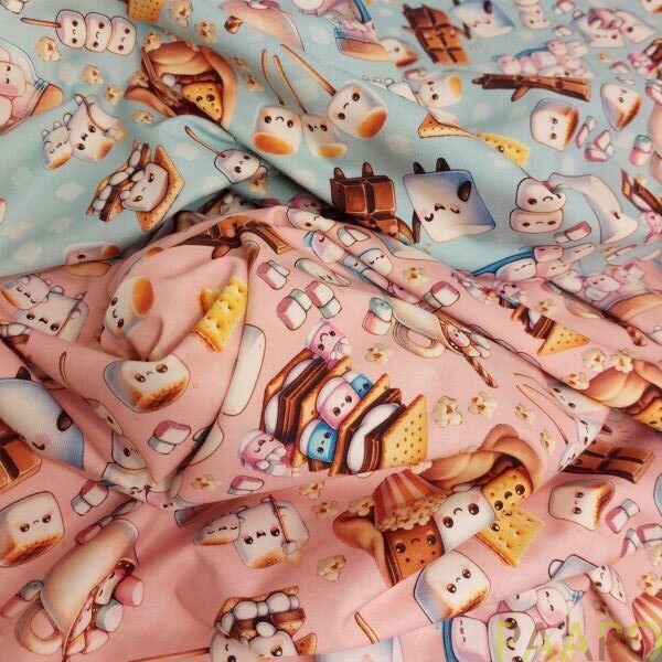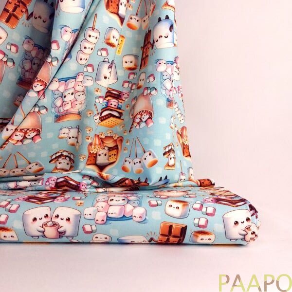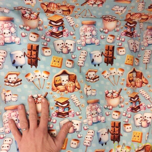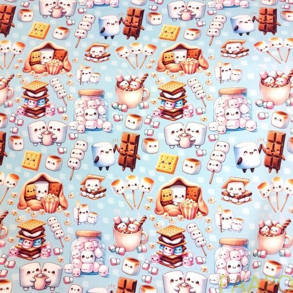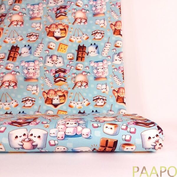 A marshmallow here and a marshmallow there. Cute treat characters on high-quality printed jersey fabric.