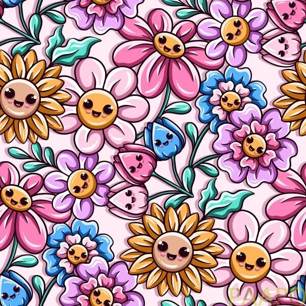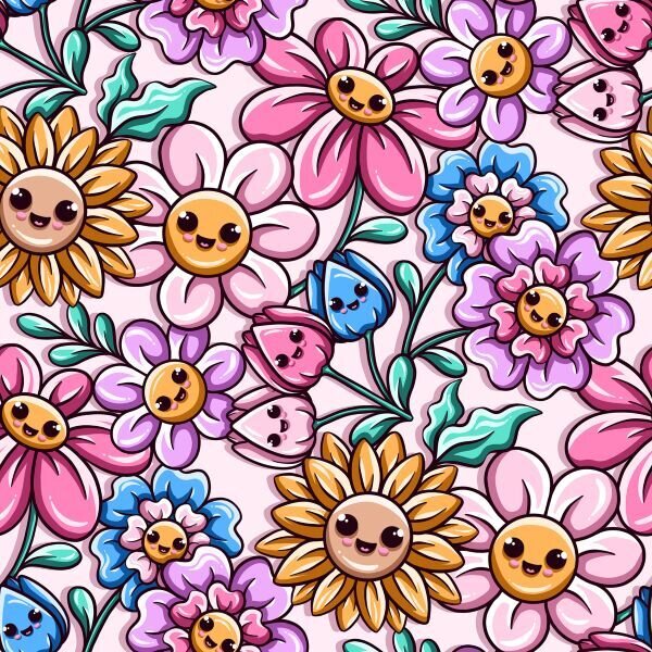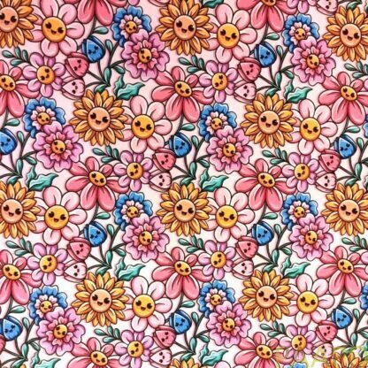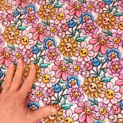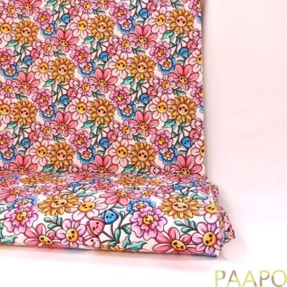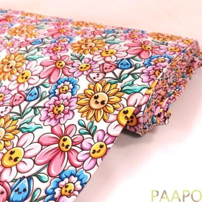 Digitally printed jersey of cheerfully smiling flowers.