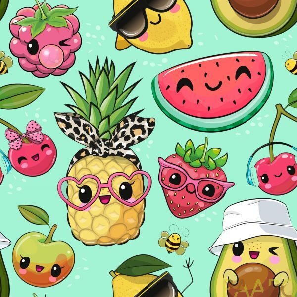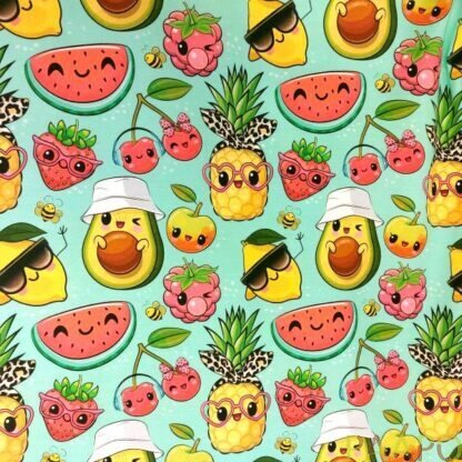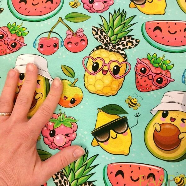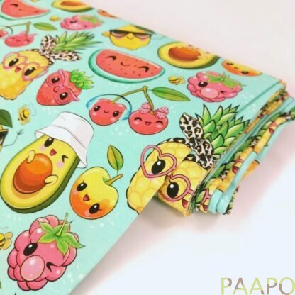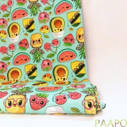 Tricot fabric with charming, cheerful fruits and berries.