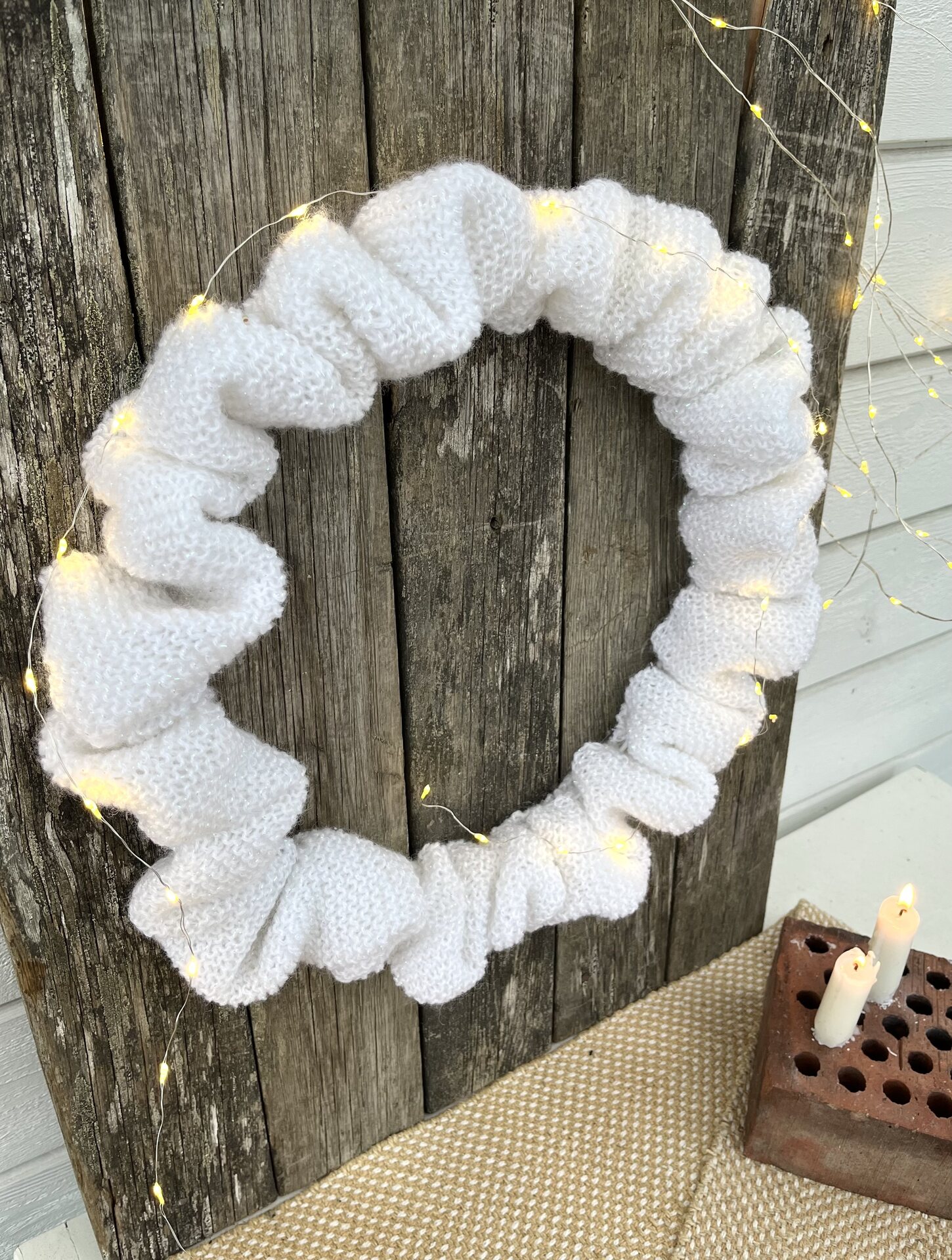 Aloita työ neulomalla kranssin päällyskappale valmiiksi. Luo puikoille 25 silmukkaa. Neulo koko kerä aina oikein -neuletta, eli joka kerroksella kaikki silmukat oikein. Pötkön pituudeksi tulee noin 1,9 m ja leveys noin 13 cm.