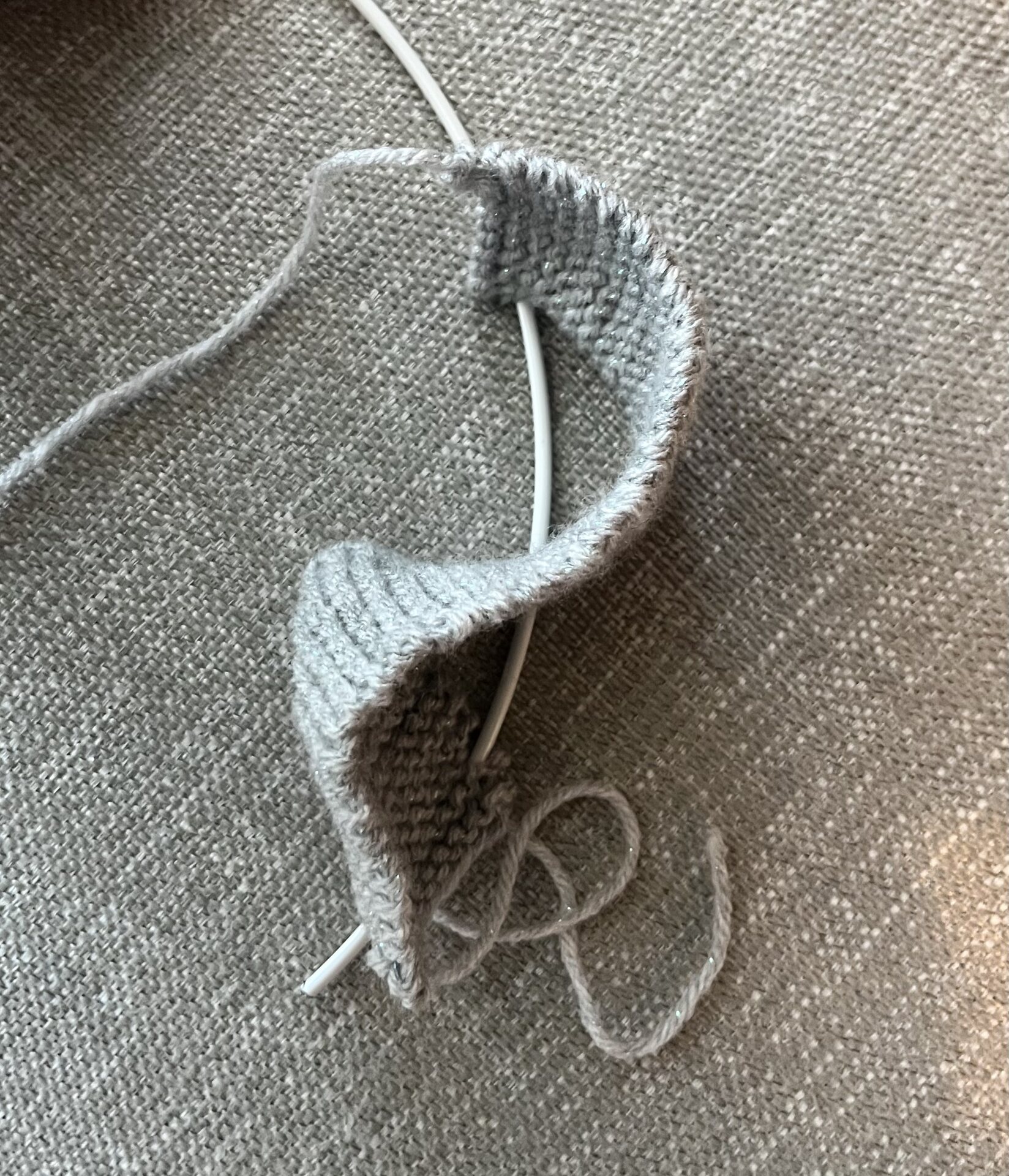 Katkaise metallirengas pihdeillä yhdistyskohdasta. Taita neulottu pötkö kaksinkerroin ja aloita pujottamaan sitä metallirenkaaseen “aaltomaisesti” noin 10 cm levyisin osioin.