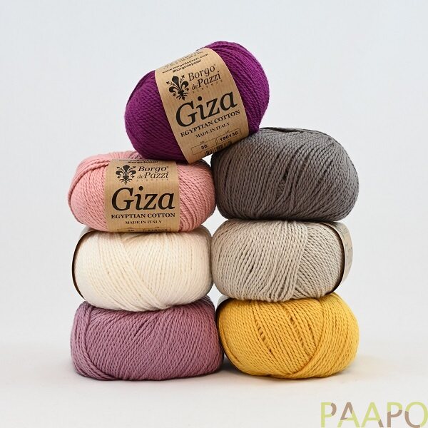 Giza on ylellinen 100 % puuvillalanka, joka tuntuu pehmeältä ja miellyttävältä ihoa vasten. Se sopii hyvin myös herkkäihoisille ja villa-allergisille.