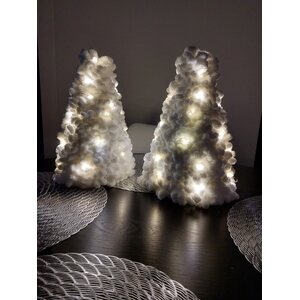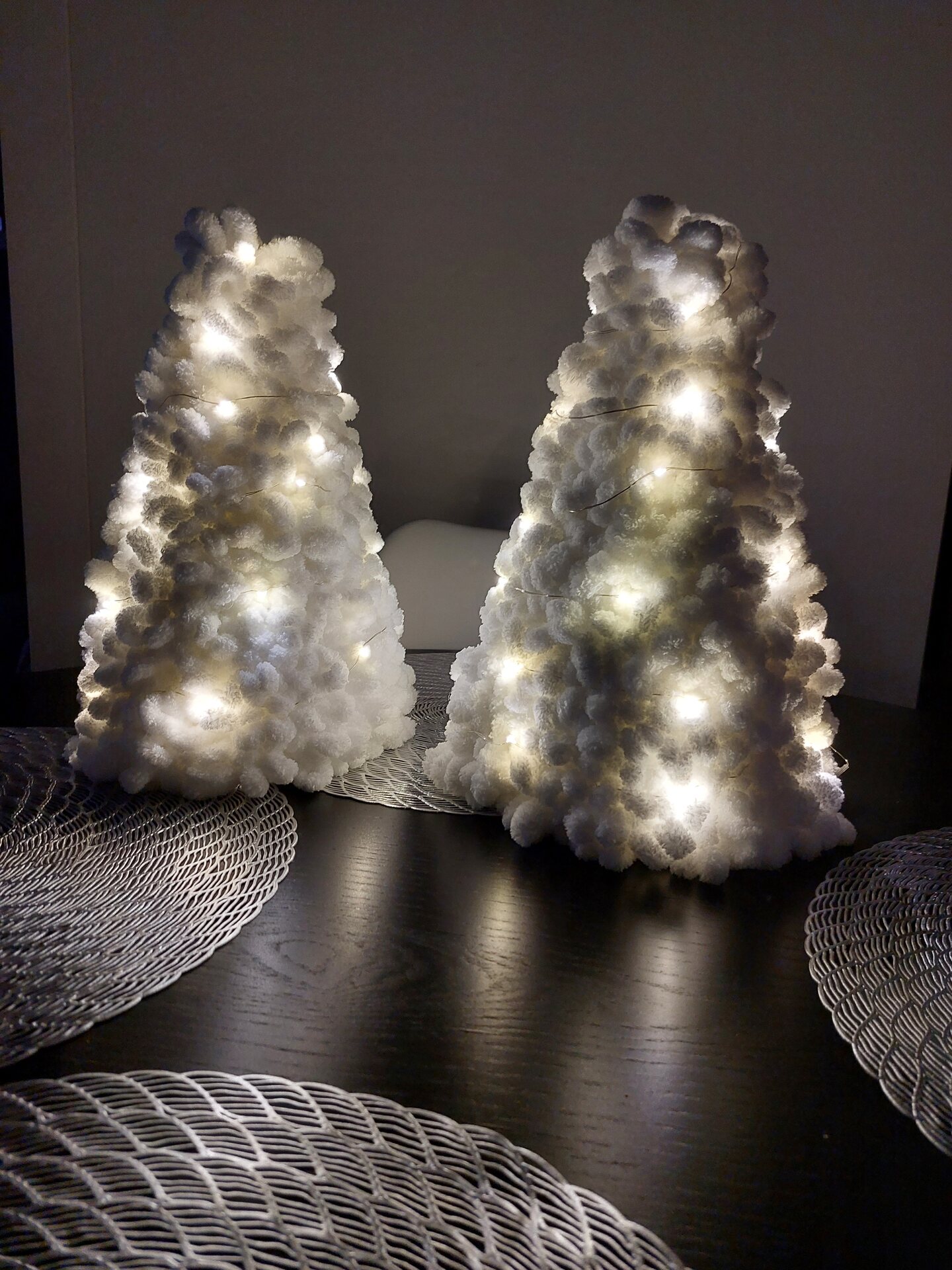 Kuusi on valmiina noin 35 cm korkea. Runkona toimii muoviverkko, jonka reikiin pujotetaan langan lenkit. Lopputulos on kuohkea ja talvinen koriste kotiin. Tämä erityisesti joulun aikaan sopiva koriste kestää katseita muinakin vuodenaikoina.