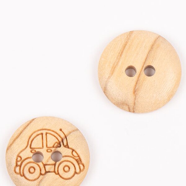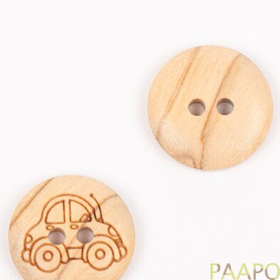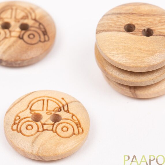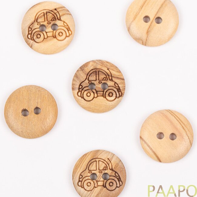 Sieviä oliivipuunappeja, jotka ovat auton muotoisia. Oliivipuusta valmistetut napit ovat paitsi kestävät, myös ympäristöystävälliset. Niillä on orgaaninen ulkonäkö, joka tulee välittymään myös neuletyöhösi. Napeissa esiintyy pieniä värin ja tekstuurin variaatioita. Nappi on kaksipuolinen, eli voit käyttää napin molemmat puolet.
