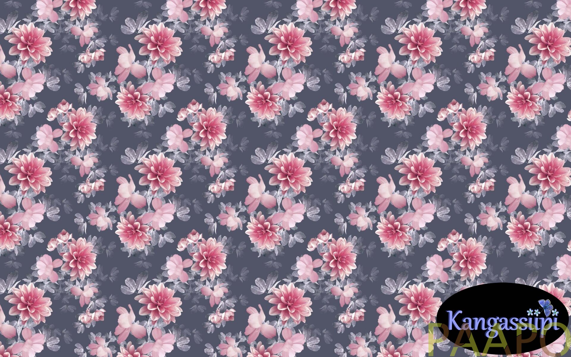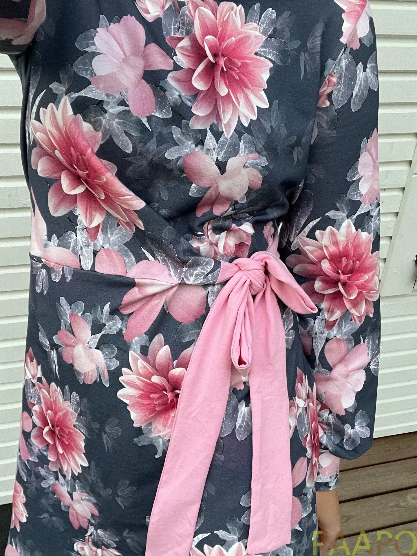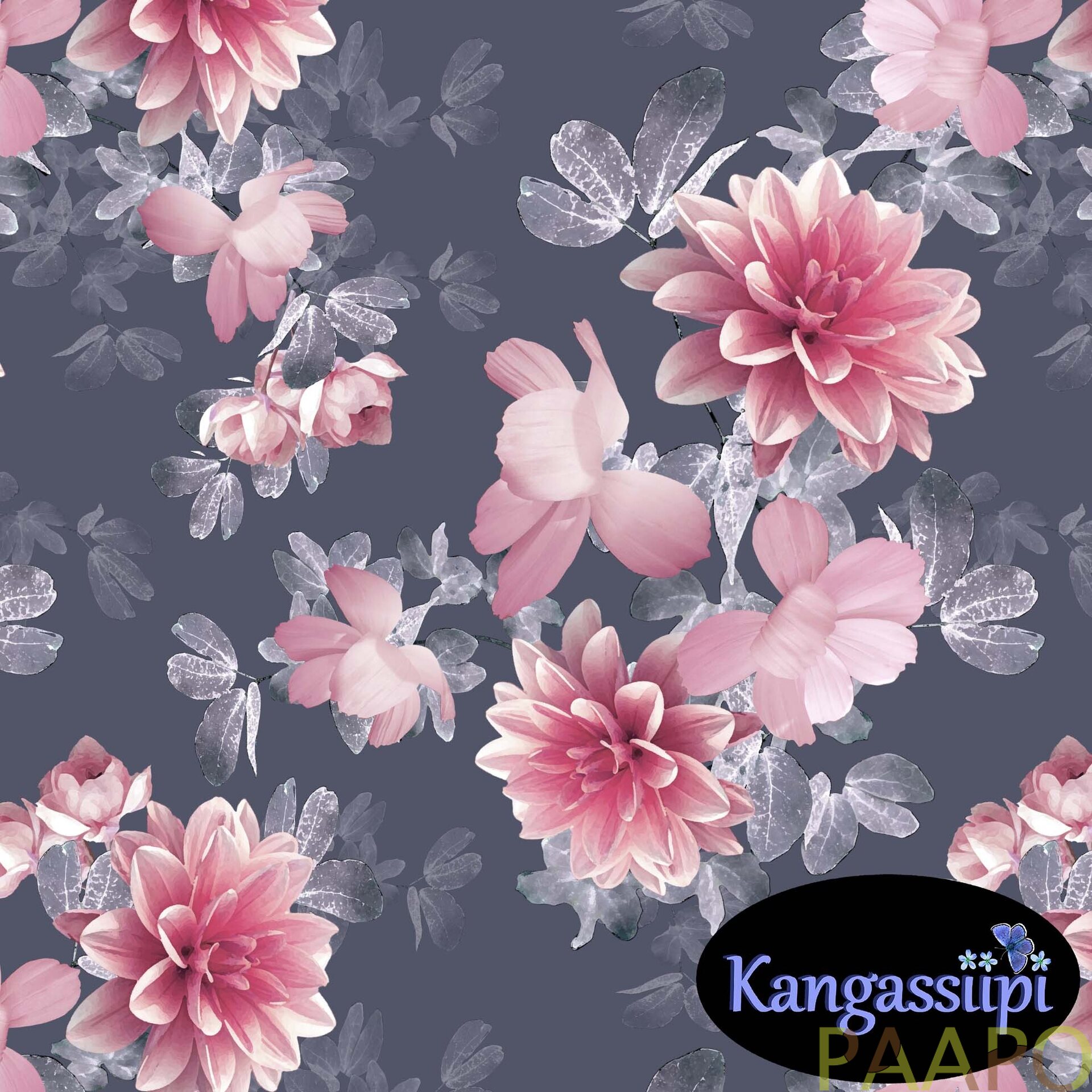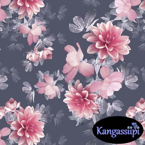 Laaduaks Uniikkien omantuotannon puuvilla elastan trikookangas. Upa kukkakuosi Veera, siniharmaana!