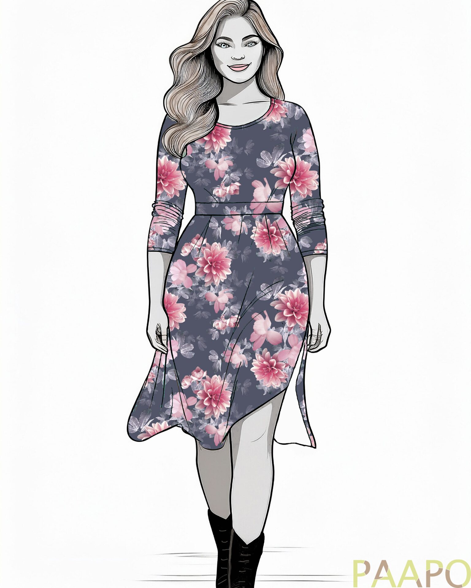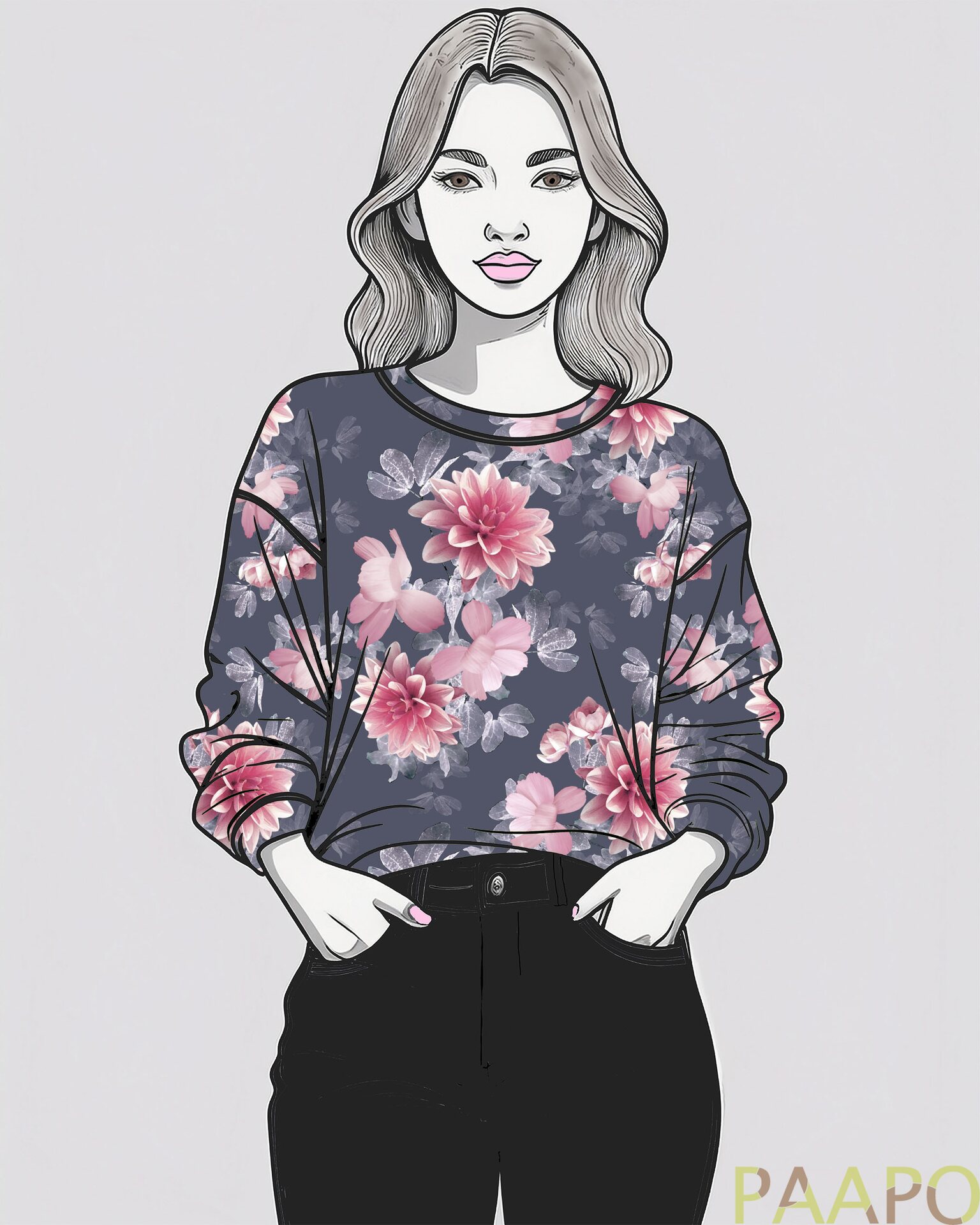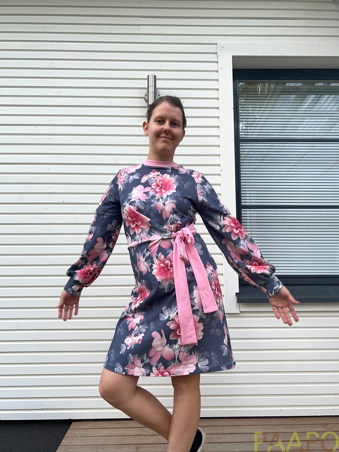Laaduaks Uniikkien omantuotannon puuvilla elastan trikookangas. Upa kukkakuosi Veera, siniharmaana!