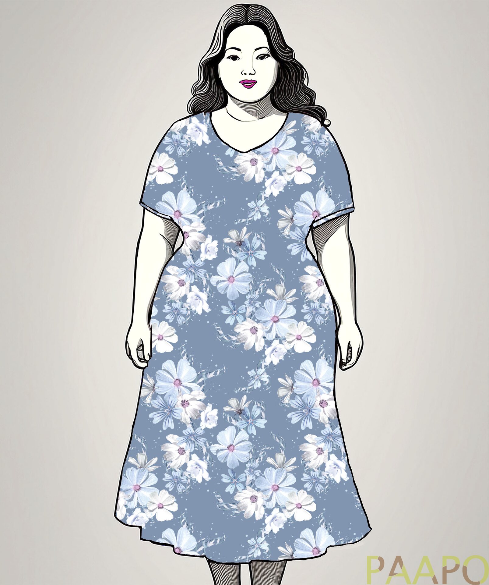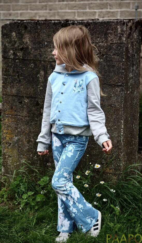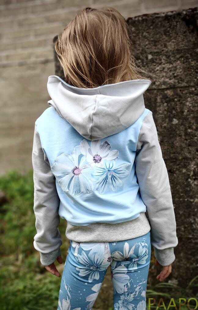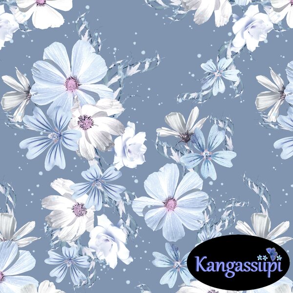 Laaduaks Uniikkien omantuotannon puuvilla elastan trikookangas. Ihana siniturkoosi sävy kukkakuoissa!