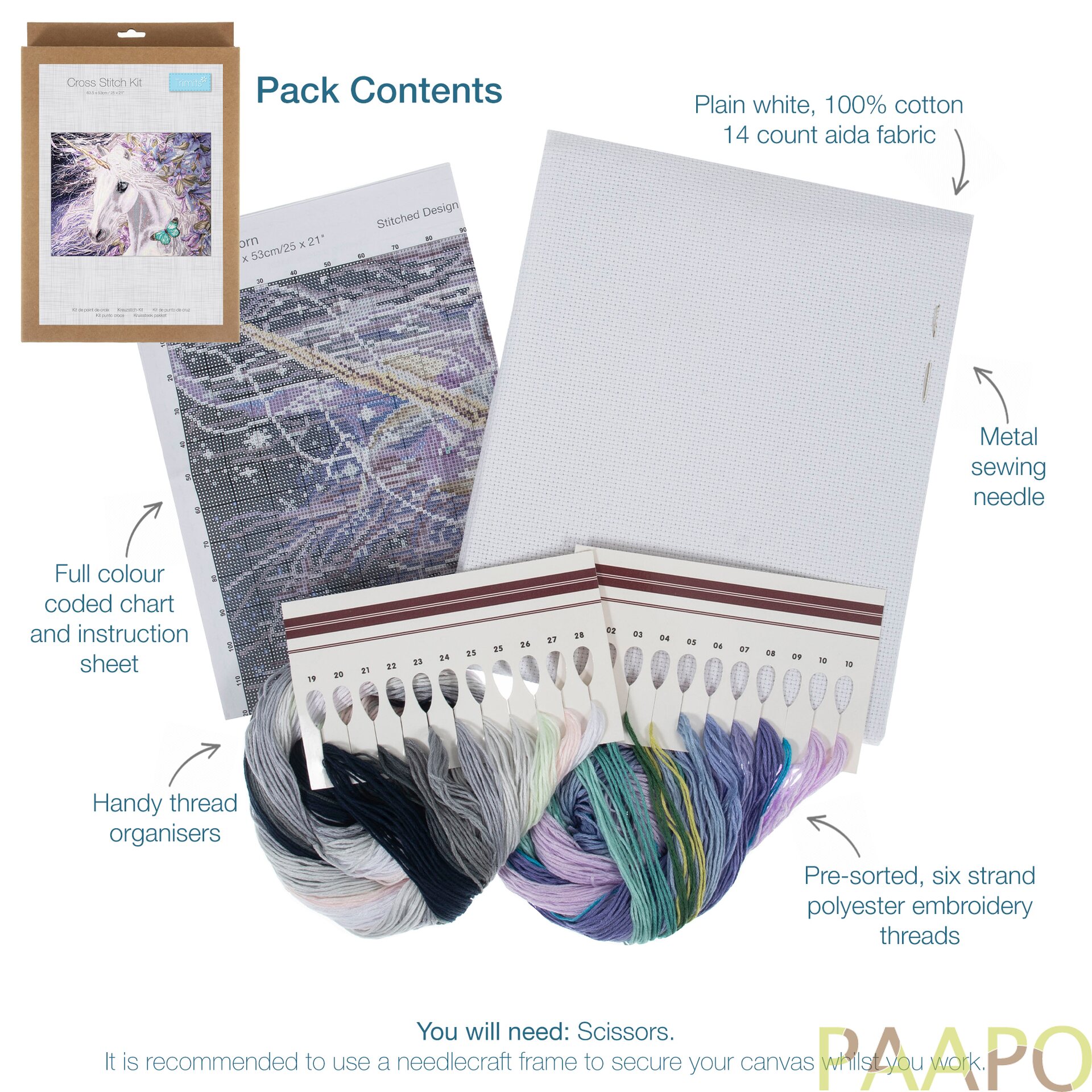 Täydellinen ristipistopakkaus - Tämä upea ristipistopakkaus sisältää valkoista puuvillaista aida 11 ristipistokangasta, 6-säikeisiä kirjontalankoja, neulan ja värikoodatut ohjeet kielillä engalanninkielellä.