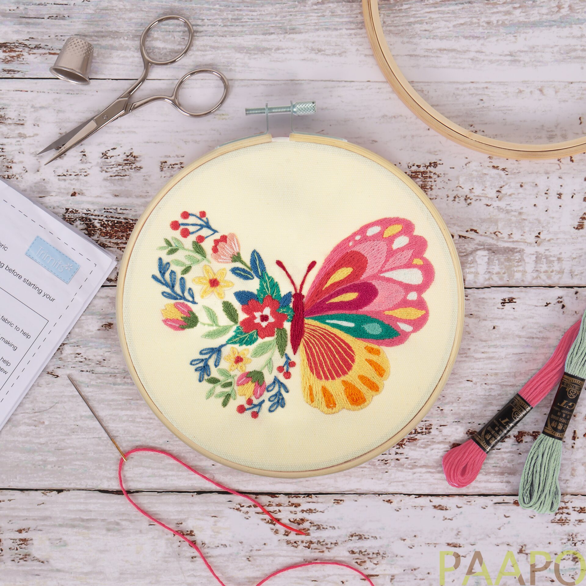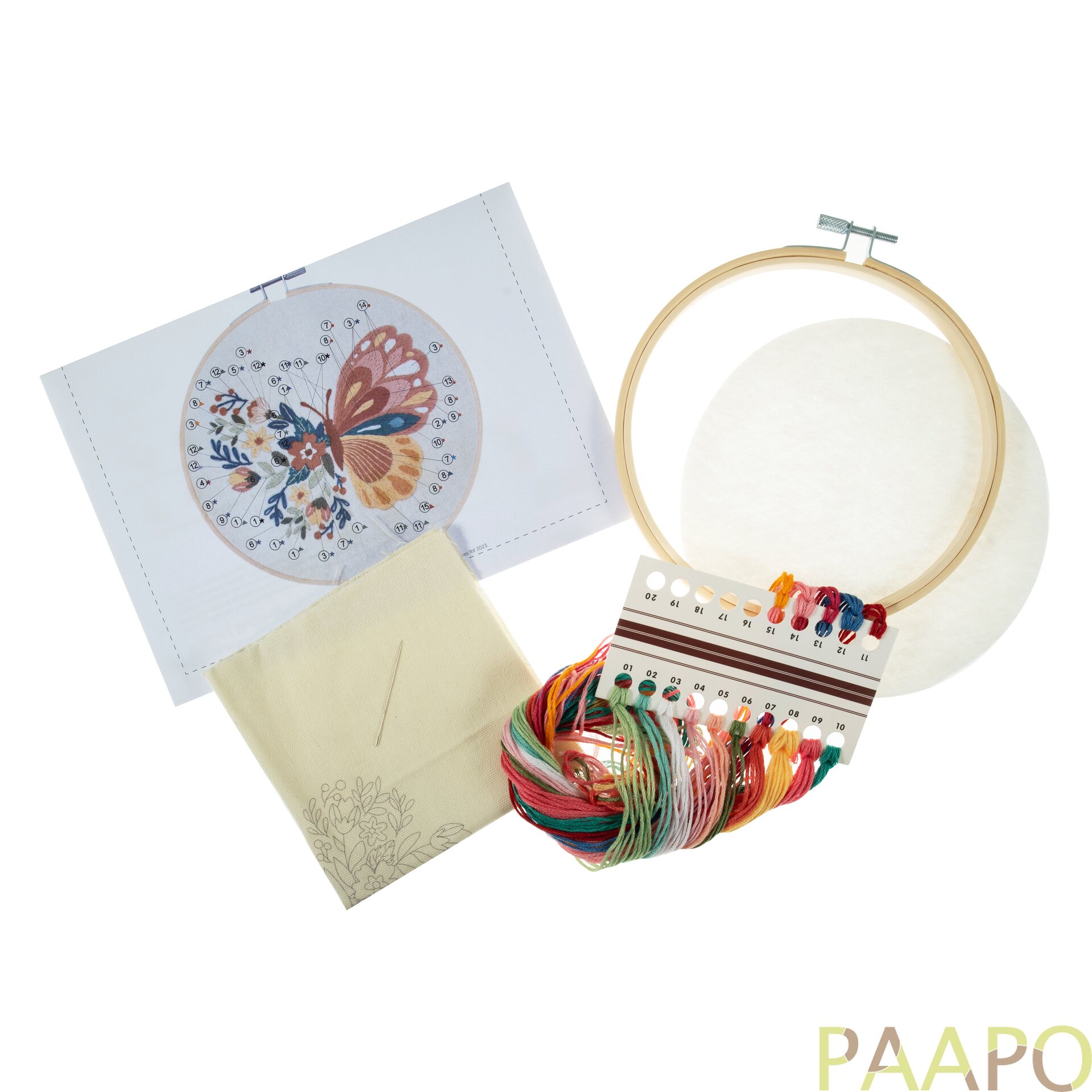 Pakkaus sisältää: 15 cm bambukehyksen, valmiiksi lajitellut 6-säikeiset kirjontalangat, kirjontaneulan, puuvillakankaan, jossa on valmiiksi painettu kuvio, huopapohjan ja ohjeet englanniksi.