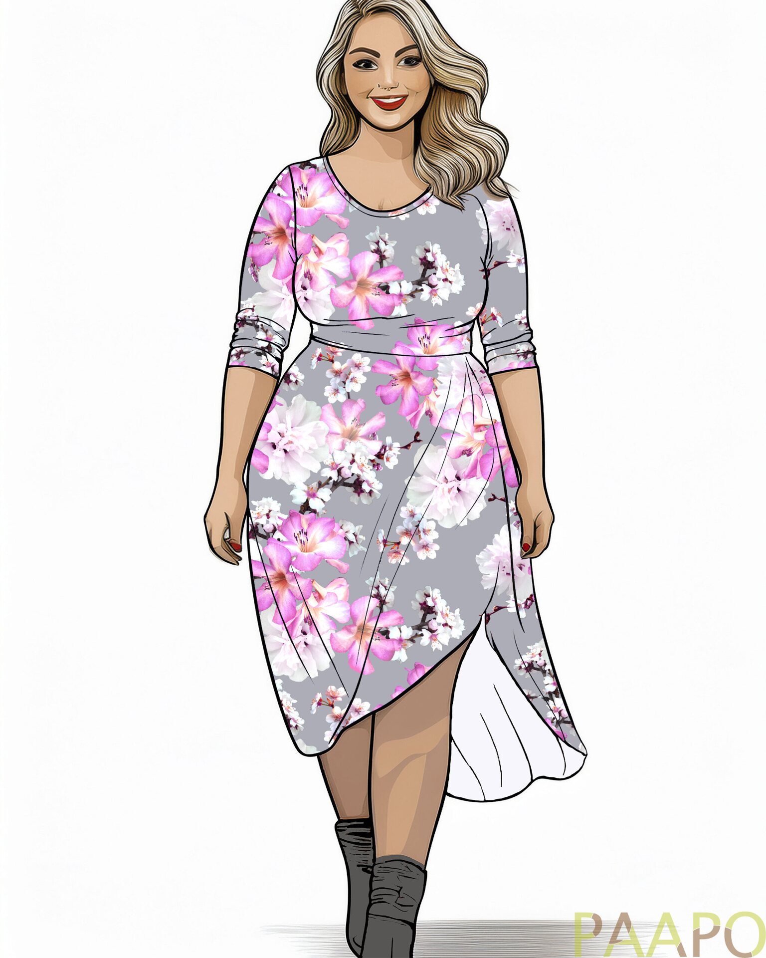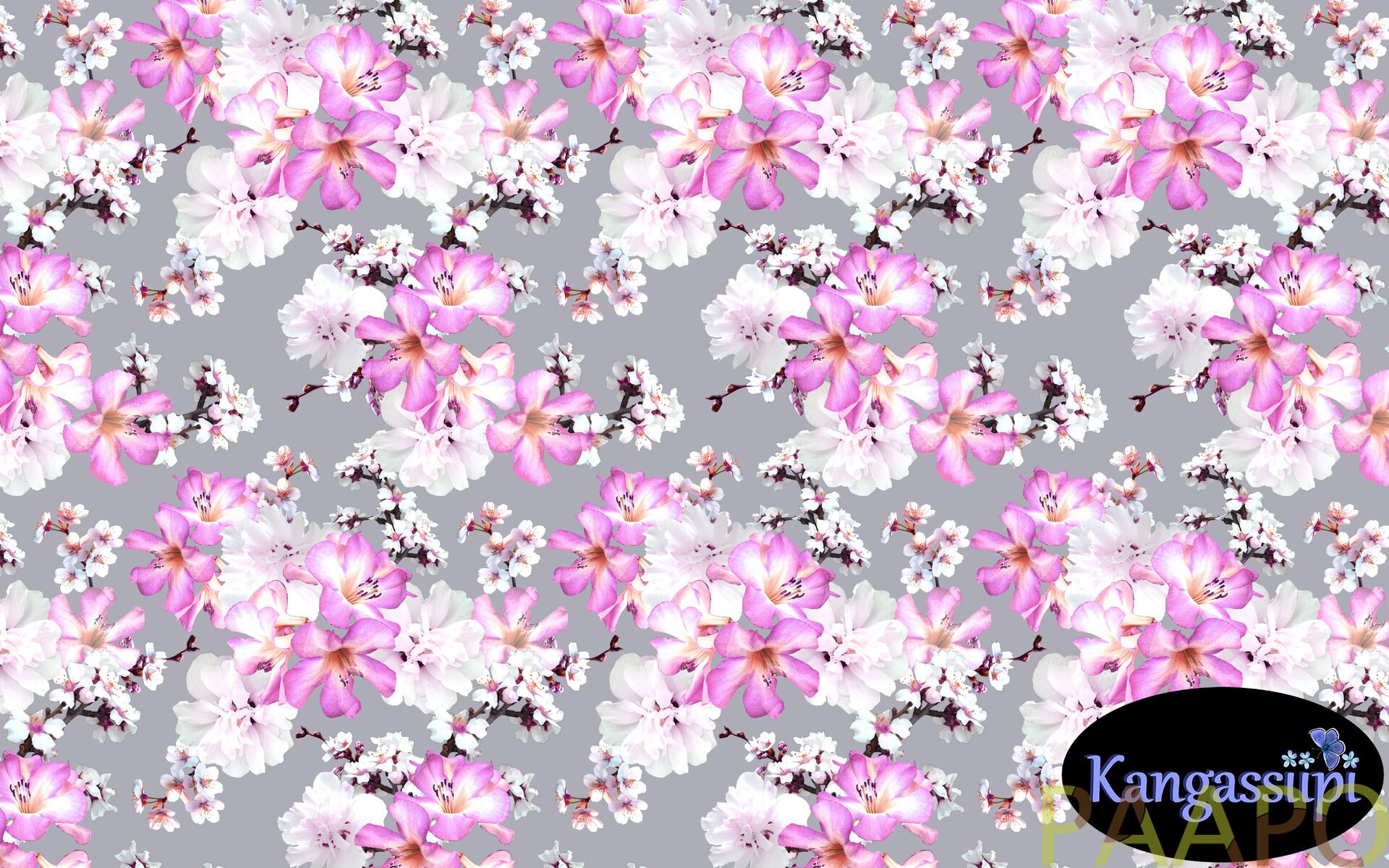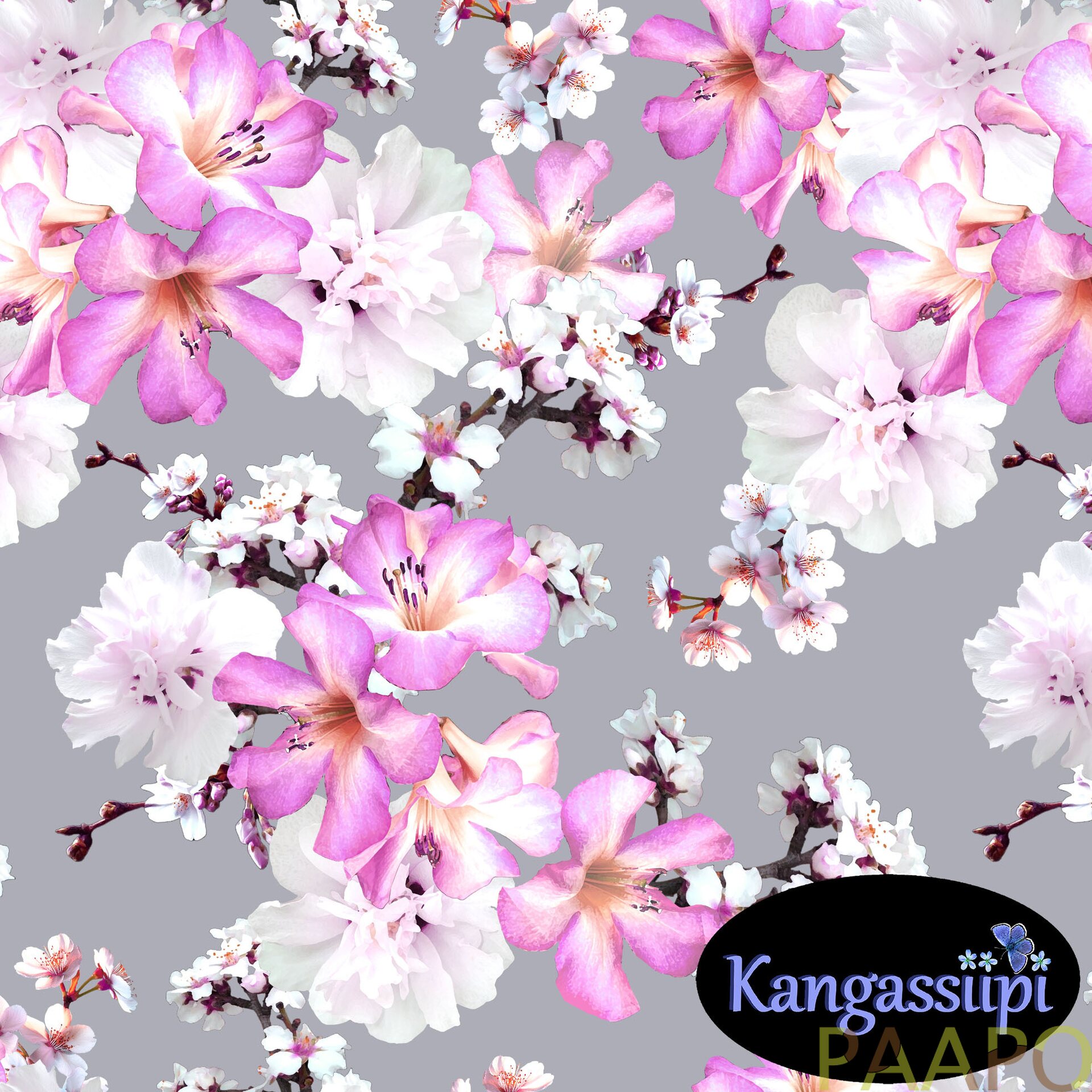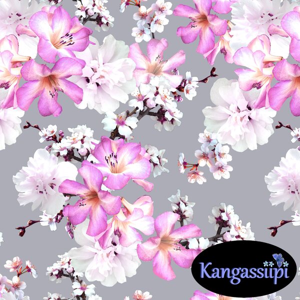 Laadukas Uniikkien omantuotannon puuvilla elastan trikookangas. Ihana kukkakuosi, upea helmenharmaa tausta!