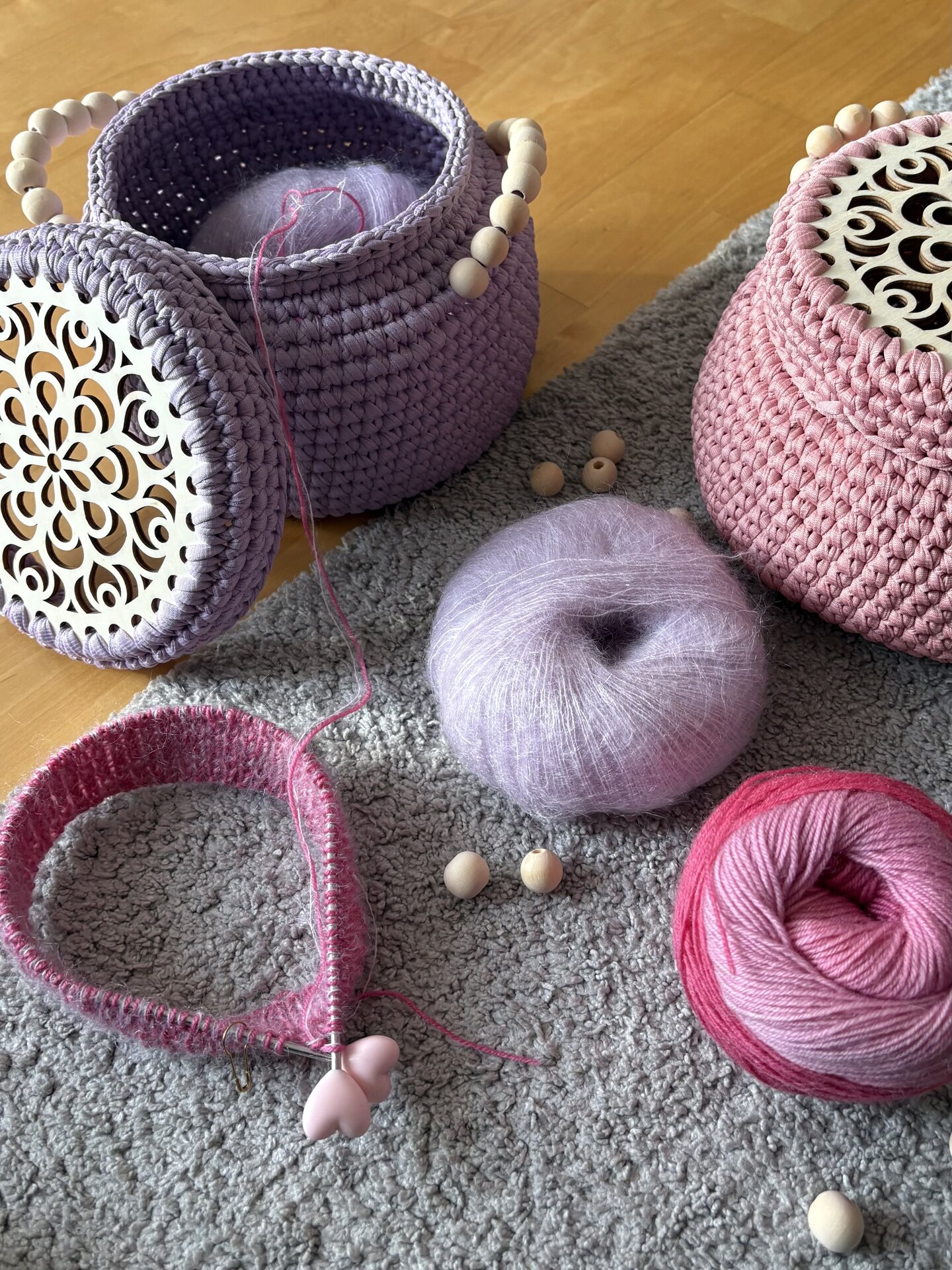 Kiinnitä lopuksi helmikahvat seuraavasti villaneulan avulla korin reunaan:
